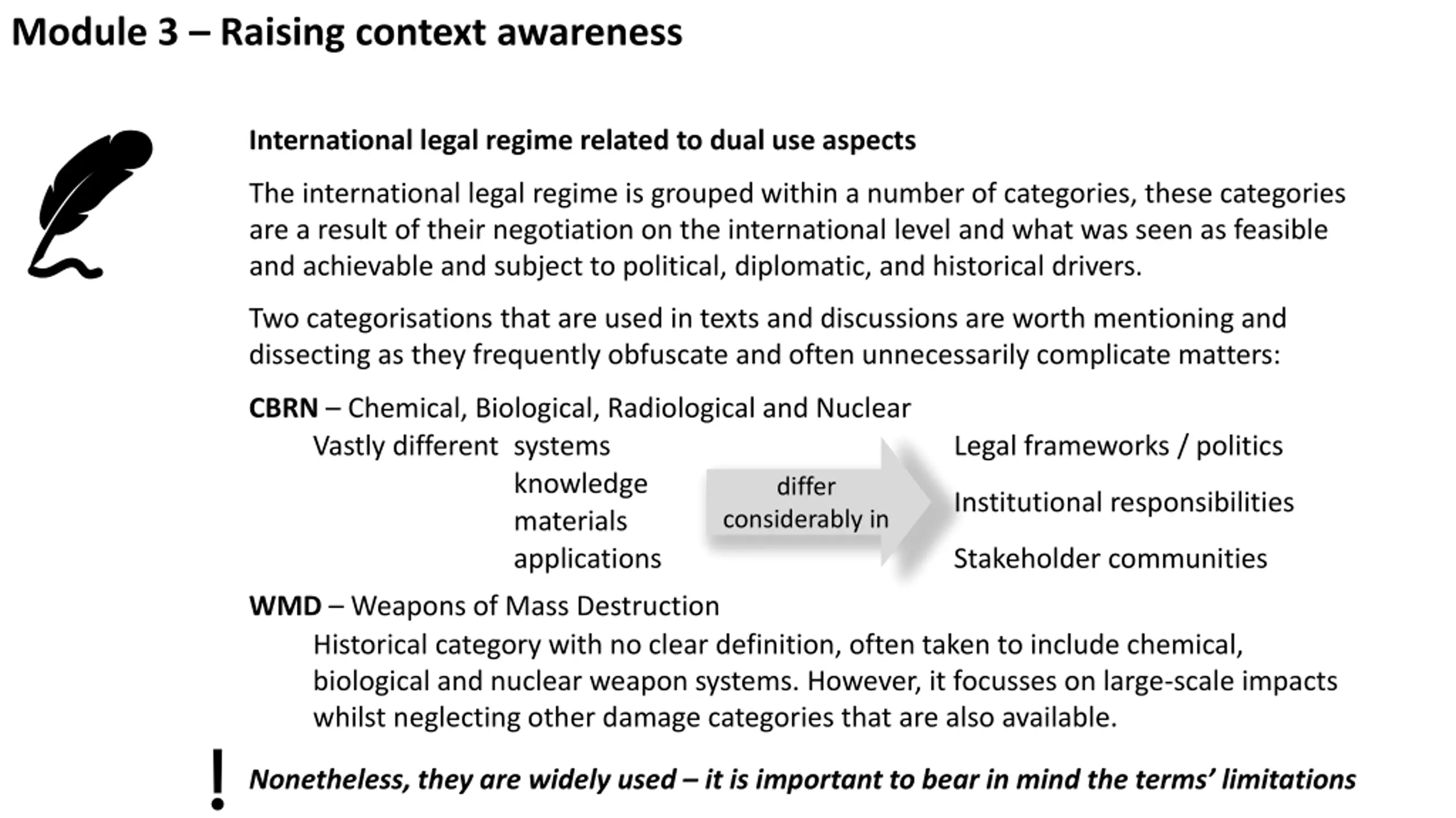 Module 3 Raising context awareness International legal regime related to dual use aspects The international legal regime is grouped within a number of categories, these categories are a result of their negotiation on the international level and what was seen as feasible and achievable and subject to political, diplomatic, and historical drivers. Two categorisations that are used in texts and discussions are worth mentioning and dissecting as they frequently obfuscate and often unnecessarily complicate matters: CBRN Chemical, Biological, Radiological and Nuclear Vastly different systems knowledge materials applications Legal frameworks / politics differ Institutional responsibilities considerably in Stakeholder communities WMD Weapons of Mass Destruction Historical category with no clear definition, often taken to include chemical, biological and nuclear weapon systems. However, it focusses on large-scale impacts whilst neglecting other damage categories that are also available. Nonetheless, they are widely used it is important to bear in mind the terms limitations