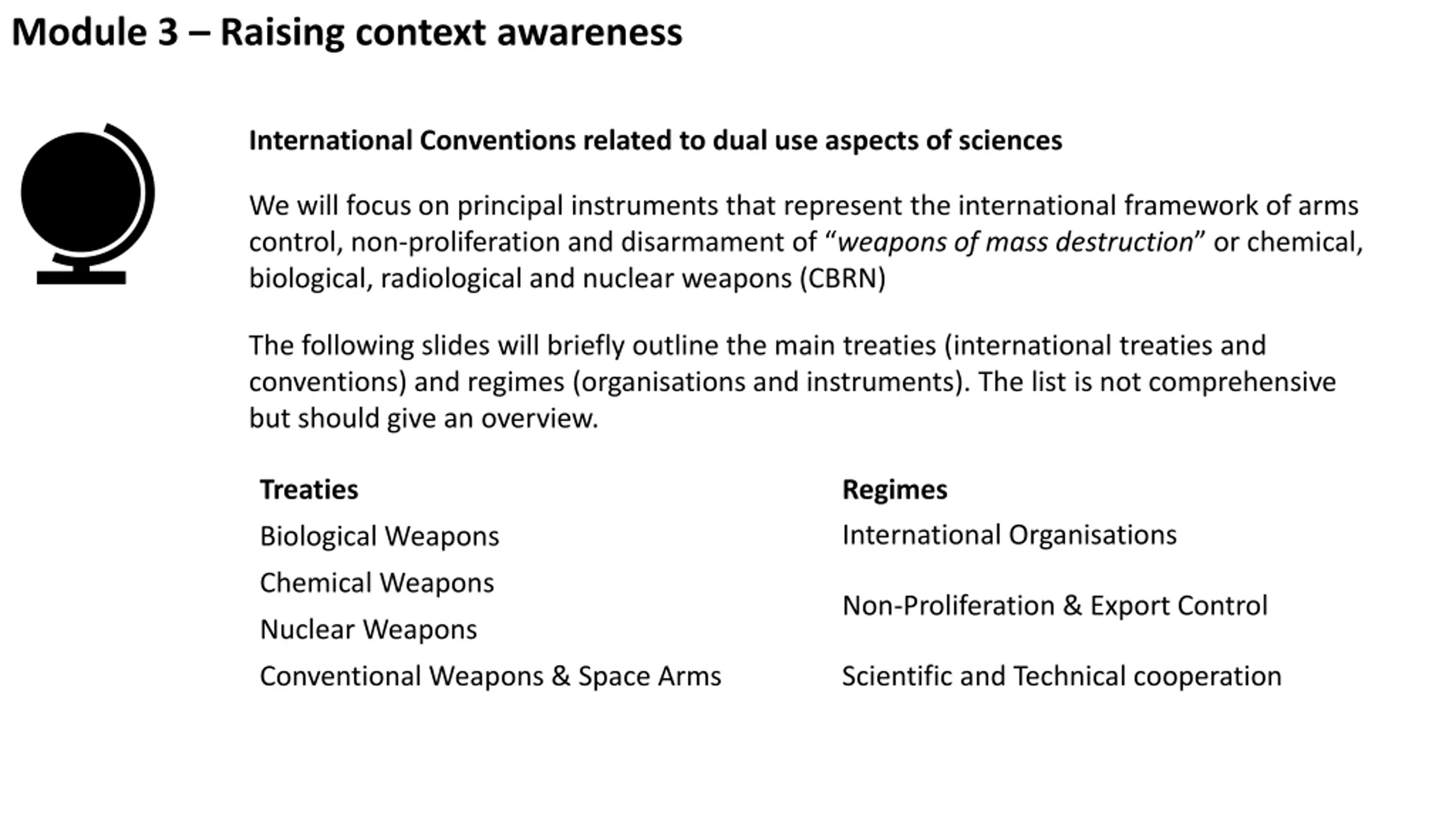 Module 3 Raising context awareness International Conventions related to dual use aspects of sciences We will focus on principal instruments that represent the international framework of arms control, non-proliferation and disarmament of weapons of mass destruction or chemical, biological, radiological and nuclear weapons (CBRN) The following slides will briefly outline the main treaties (international treaties and conventions) and regimes (organisations and instruments). The list is not comprehensive but should give an overview. Treaties Regimes International Organisations Biological Weapons Chemical Weapons Non-Proliferation & Export Control Nuclear Weapons Conventional Weapons & Space Arms Scientific and Technical cooperation