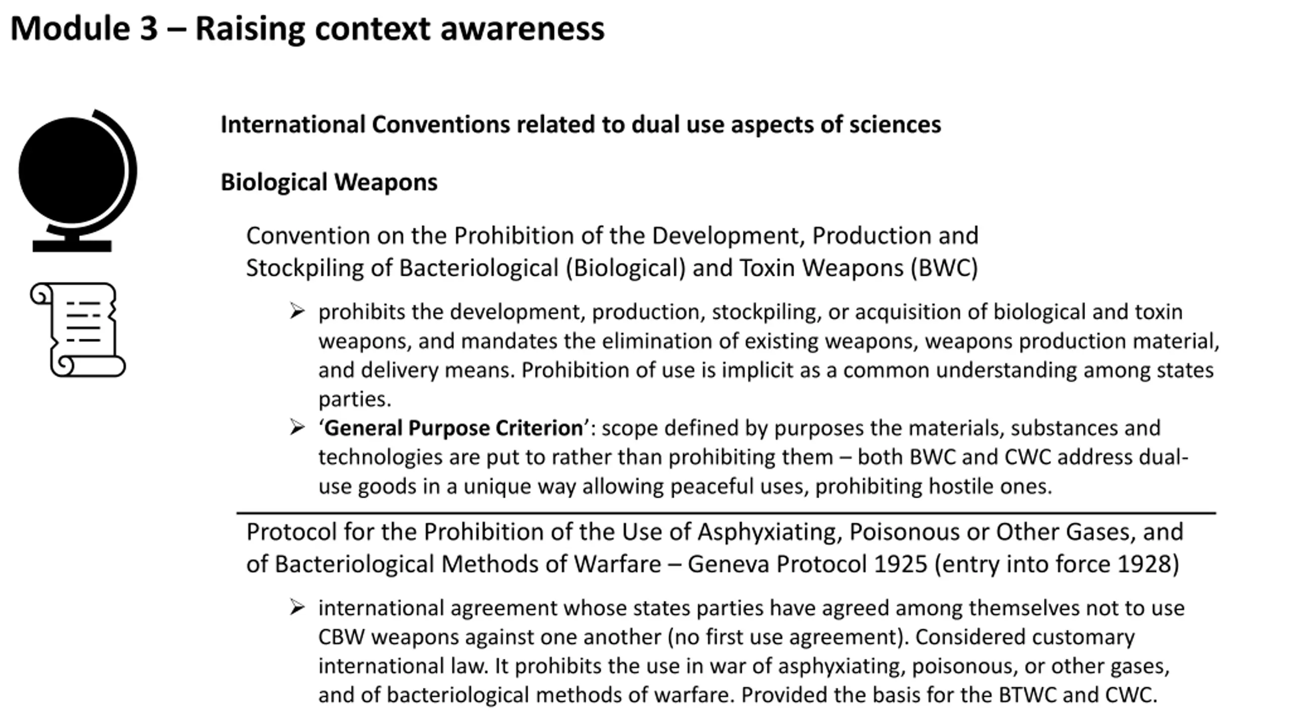 Module 3 Raising context awareness International Conventions related to dual use aspects of sciences Biological Weapons Convention on the Prohibition of the Development, Production and Stockpiling of Bacteriological (Biological) and Toxin Weapons (BWC) prohibits the development, production, stockpiling, or acquisition of biological and toxin weapons, and mandates the elimination of existing weapons, weapons production material, and delivery means. Prohibition of use is implicit as a common understanding among states parties. General Purpose Criterion : scope defined by purposes the materials, substances and technologies are put to rather than prohibiting them both BWC and CWC address dual- use goods in a unique way allowing peaceful uses, prohibiting hostile ones. Protocol for the Prohibition of the Use of Asphyxiating, Poisonous or Other Gases, and of Bacteriological Methods of Warfare Geneva Protocol 1925 (entry into force 1928) international agreement whose states parties have agreed among themselves not to use CBW weapons against one another (no first use agreement). Considered customary international law. It prohibits the use in war of asphyxiating, poisonous, or other gases, and of bacteriological methods of warfare. Provided the basis for the BTWC and CWC.