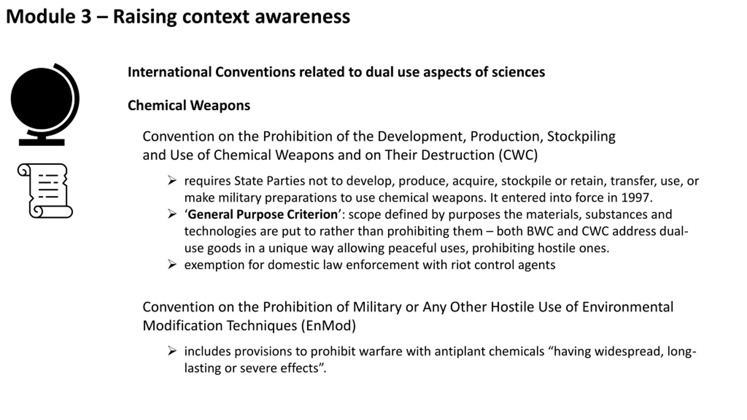 Module 3 Raising context awareness International Conventions related to dual use aspects of sciences Chemical Weapons Convention on the Prohibition of the Development, Production, Stockpiling and Use of Chemical Weapons and on Their Destruction (CWC) requires State Parties not to develop, produce, acquire, stockpile or retain, transfer, use, or make military preparations to use chemical weapons. It entered into force in 1997. General Purpose Criterion : scope defined by purposes the materials, substances and technologies are put to rather than prohibiting them both BWC and CWC address dual- use goods in a unique way allowing peaceful uses, prohibiting hostile ones. exemption for domestic law enforcement with riot control agents Convention on the Prohibition of Military or Any Other Hostile Use of Environmental Modification Techniques (EnMod) includes provisions to prohibit warfare with antiplant chemicals having widespread, long- lasting or severe effects .