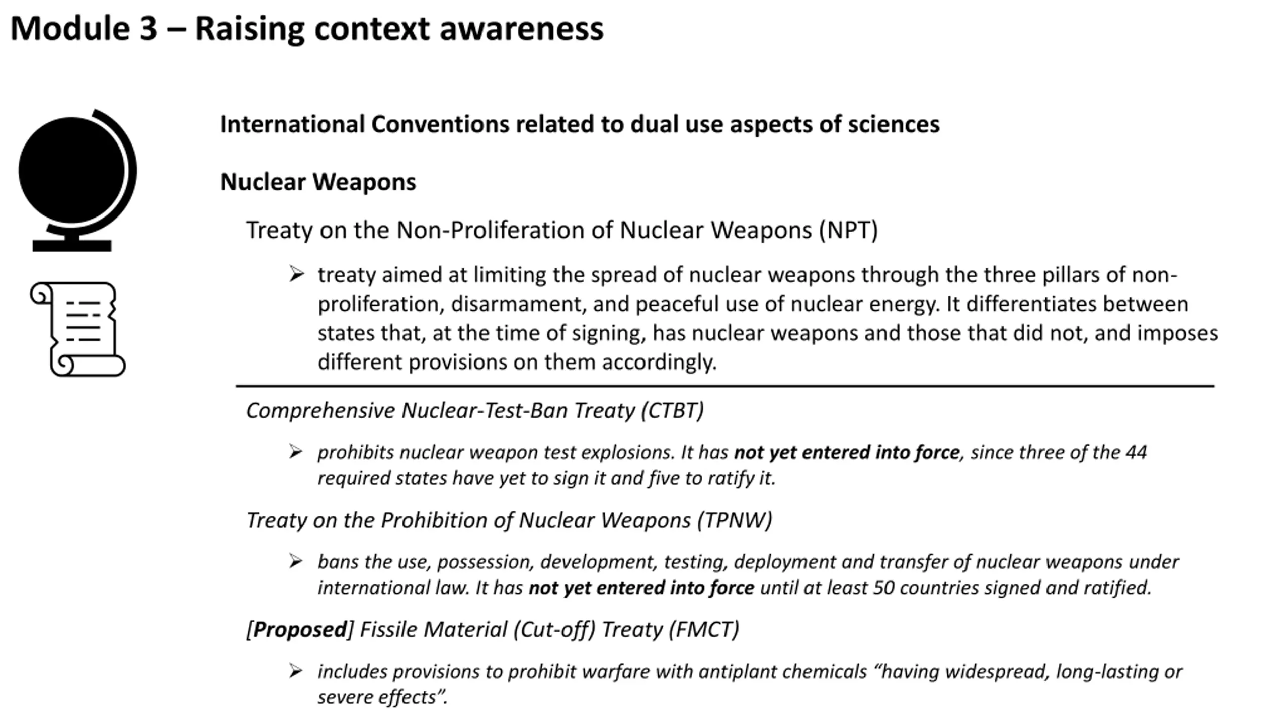 Module 3 Raising context awareness International Conventions related to dual use aspects of sciences Nuclear Weapons Treaty on the Non-Proliferation of Nuclear Weapons (NPT) treaty aimed at limiting the spread of nuclear weapons through the three pillars of non- proliferation, disarmament, and peaceful use of nuclear energy. It differentiates between states that, at the time of signing, has nuclear weapons and those that did not, and imposes different provisions on them accordingly. Comprehensive Nuclear-Test-Ban Treaty (CTBT) prohibits nuclear weapon test explosions. It has not yet entered into force, since three of the 44 required states have yet to sign it and five to ratify it. Treaty on the Prohibition of Nuclear Weapons (TPNW) bans the use, possession, development, testing, deployment and transfer of nuclear weapons under international law. It has not yet entered into force until at least 50 countries signed and ratified. [Proposed] Fissile Material (Cut-off) Treaty (FMCT) includes provisions to prohibit warfare with antiplant chemicals having widespread, long-lasting or severe effects .