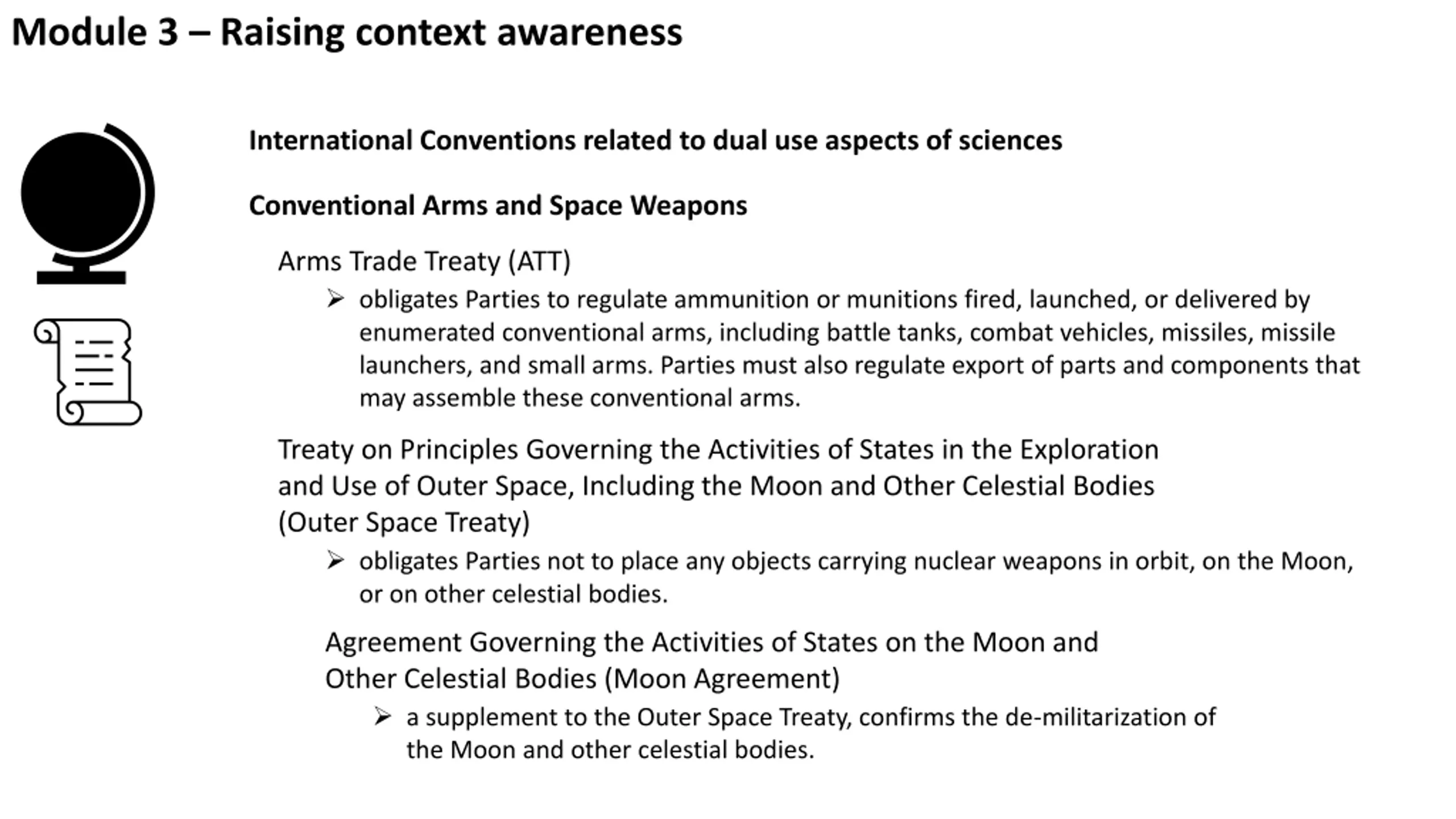 Module 3 Raising context awareness International Conventions related to dual use aspects of sciences Conventional Arms and Space Weapons Arms Trade Treaty (ATT) obligates Parties to regulate ammunition or munitions fired, launched, or delivered by enumerated conventional arms, including battle tanks, combat vehicles, missiles, missile launchers, and small arms. Parties must also regulate export of parts and components that may assemble these conventional arms. Treaty on Principles Governing the Activities of States in the Exploration and Use of Outer Space, Including the Moon and Other Celestial Bodies (Outer Space Treaty) obligates Parties not to place any objects carrying nuclear weapons in orbit, on the Moon, or on other celestial bodies. Agreement Governing the Activities of States on the Moon and Other Celestial Bodies (Moon Agreement) a supplement to the Outer Space Treaty, confirms the de-militarization of the Moon and other celestial bodies.