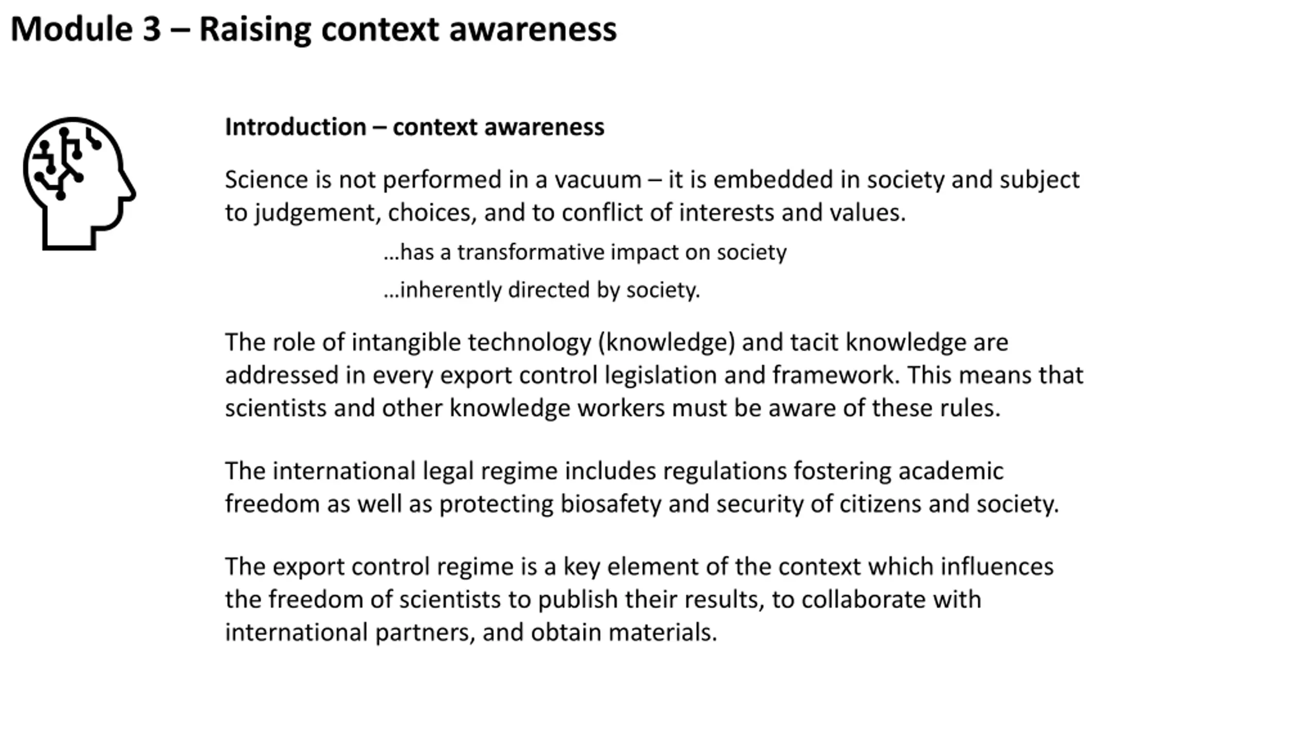 Module 3 Raising context awareness Introduction context awareness Science is not performed in a vacuum it is embedded in society and subject to judgement, choices, and to conflict of interests and values. has a transformative impact on society inherently directed by society. The role of intangible technology (knowledge) and tacit knowledge are addressed in every export control legislation and framework. This means that scientists and other knowledge workers must be aware of these rules. The international legal regime includes regulations fostering academic freedom as well as protecting biosafety and security of citizens and society. The export control regime is a key element of the context which influences the freedom of scientists to publish their results, to collaborate with international partners, and obtain materials.