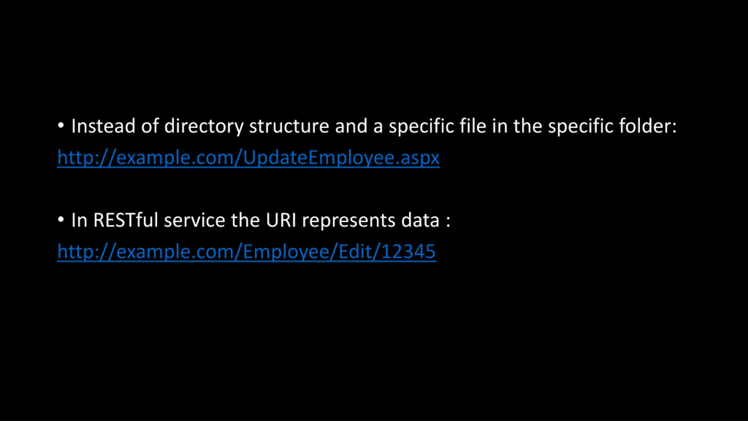 Instead of directory structure and a specific file in the specific folder: http://example.com/UpdateEmployee.aspx In RESTful service the URI represents data : http://example.com/Employee/Edit/12345
