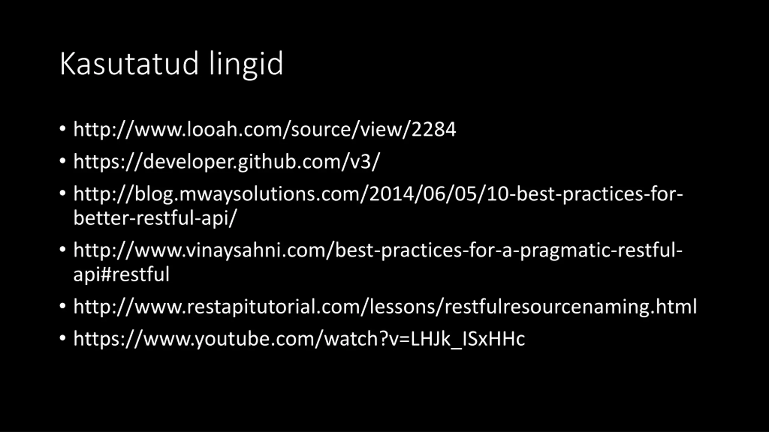 Kasutatud lingid http://www.looah.com/source/view/2284 https://developer.github.com/v3/ http://blog.mwaysolutions.com/2014/06/05/10-best-practices-for- better-restful-api/ http://www.vinaysahni.com/best-practices-for-a-pragmatic-restful- api#restful http://www.restapitutorial.com/lessons/restfulresourcenaming.html https://www.youtube.com/watch?v=LHJk_ISxHHc