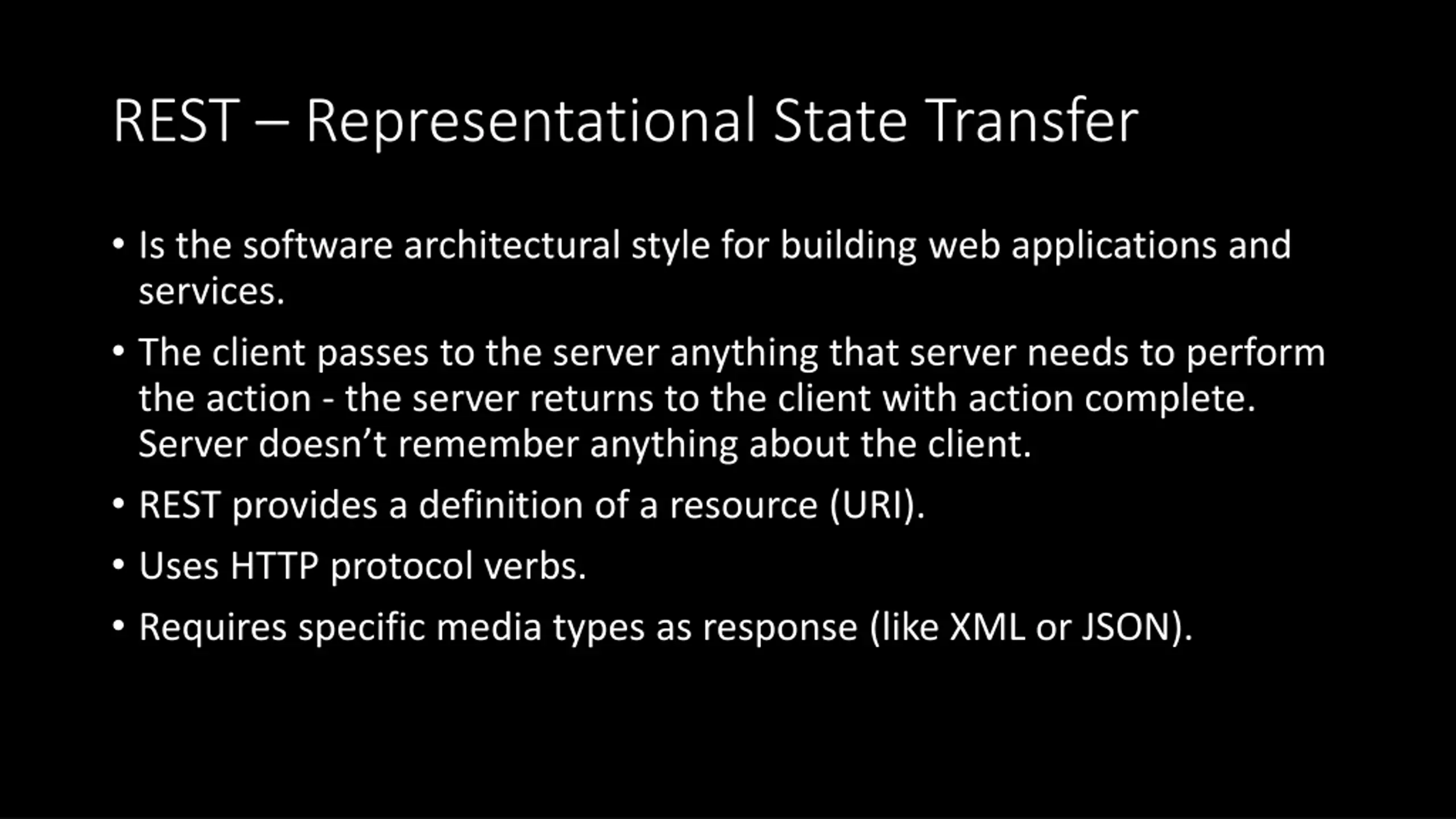 REST Representational State Transfer Is the software architectural style for building web applications and services. The client passes to the server anything that server needs to perform the action - the server returns to the client with action complete. Server doesn t remember anything about the client. REST provides a definition of a resource (URI). Uses HTTP protocol verbs. Requires specific media types as response (like XML or JSON).