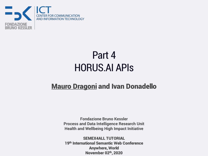 Part 4 HORUS.AI APIs Mauro Dragoniand Ivan Donadello Fondazione Bruno Kessler Process and Data Intelligence Research Unit Health and Wellbeing High Impact Initiative SEMEX4ALL TUTORIAL 19thInternational Semantic Web Conference Anywhere, World November 02th, 2020