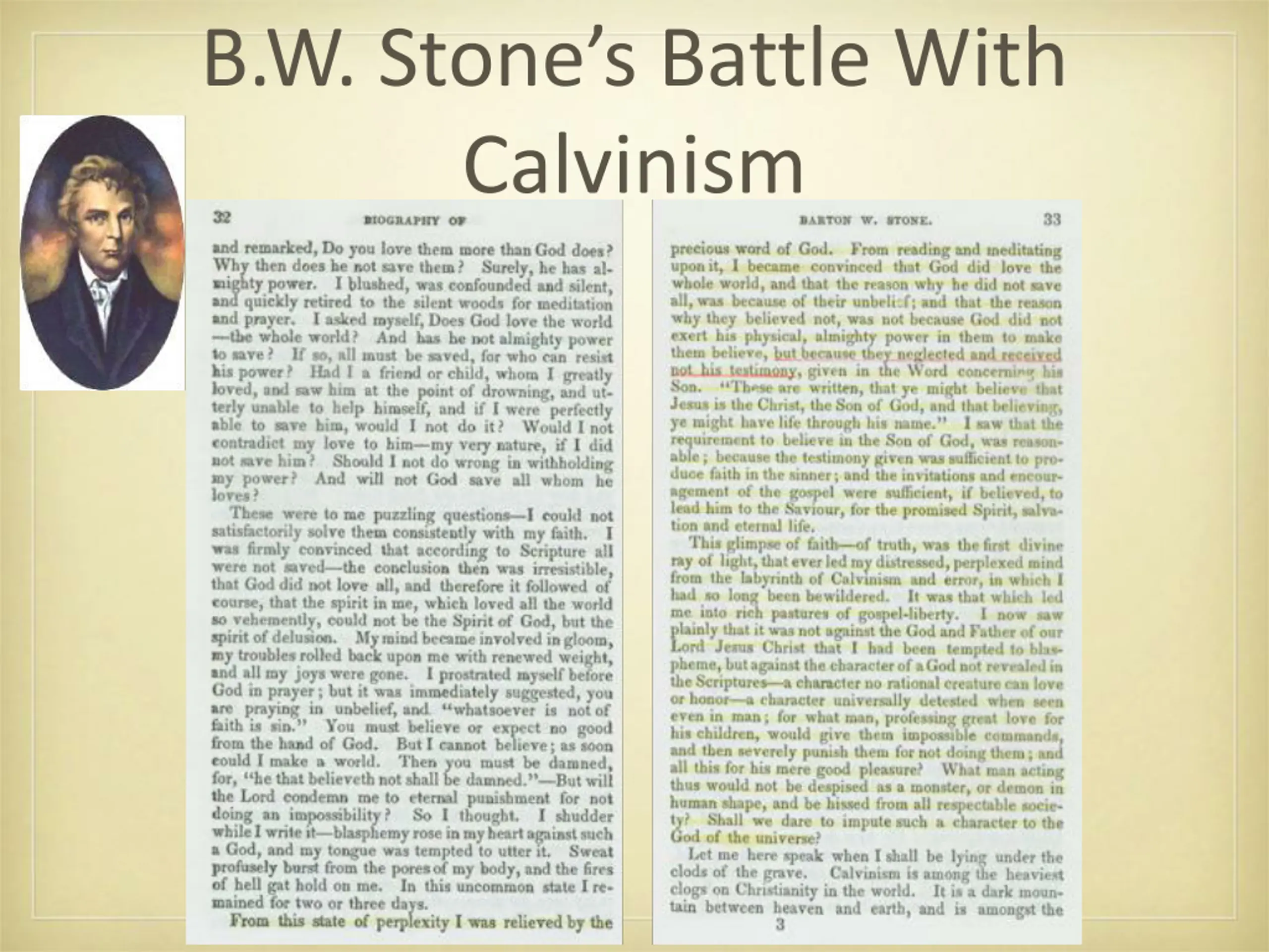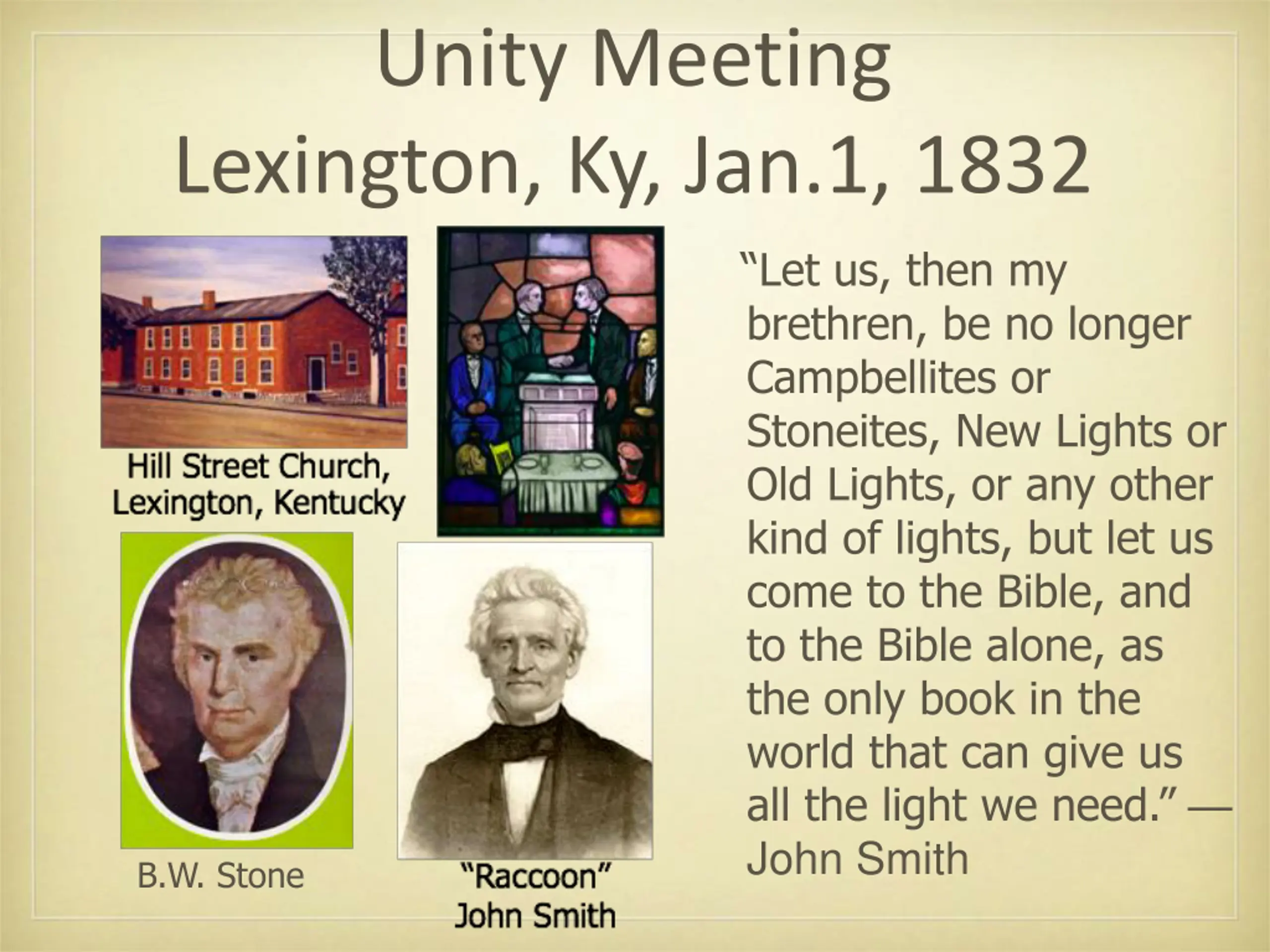 Unity Meeting Lexington, Ky, Jan.1, 1832 Let us, then my brethren, be no longer Campbellites or Stoneites, New Lights or Old Lights, or any other kind of lights, but let us come to the Bible, and to the Bible alone, as the only book in the world that can give us all the light we need. John Smith B.W. Stone