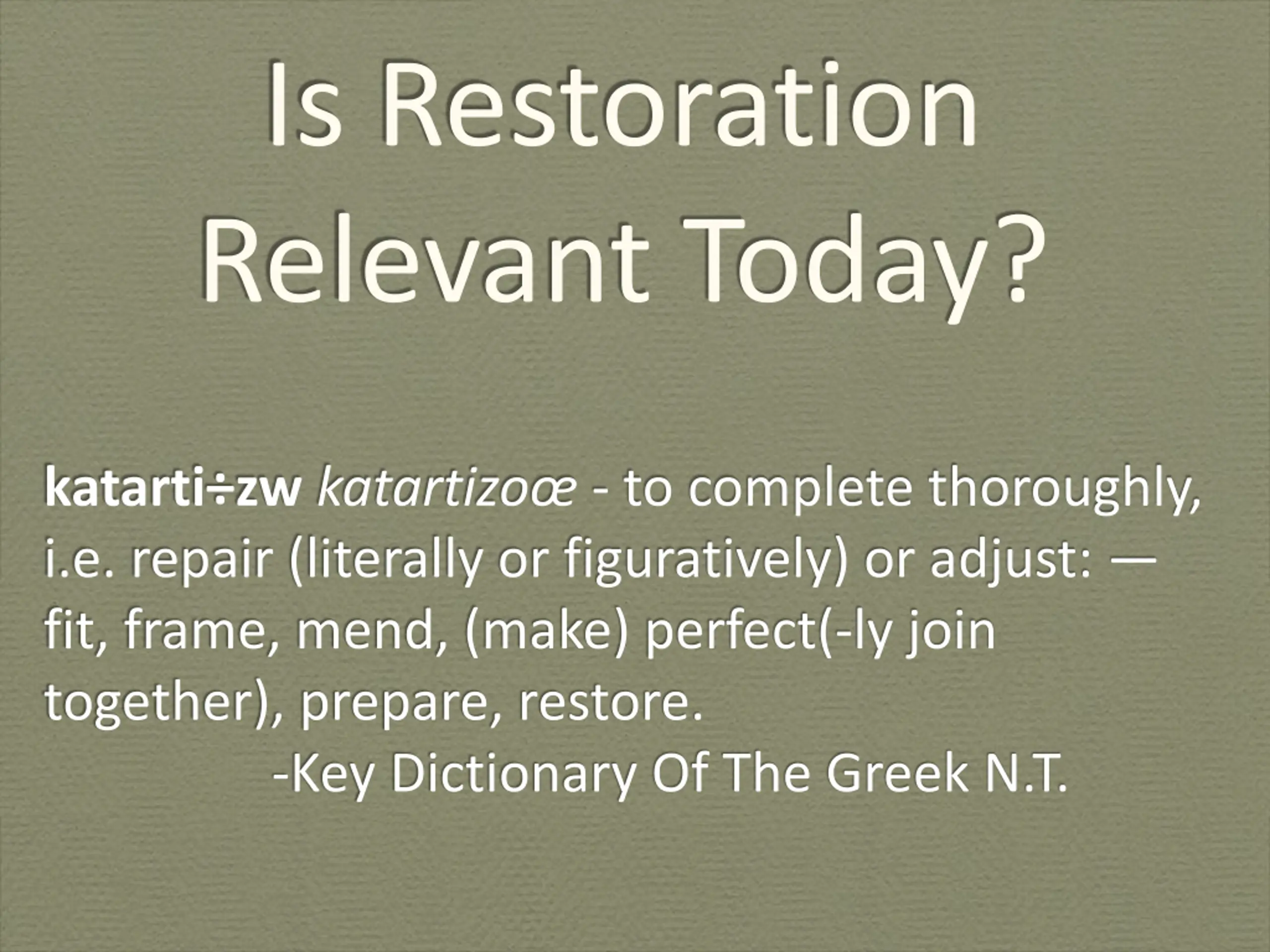 Is Restoration Relevant Today? katarti zw katartizo - to complete thoroughly, i.e. repair (literally or figuratively) or adjust: fit, frame, mend, (make) perfect(-ly join together), prepare, restore. -Key Dictionary Of The Greek N.T.
