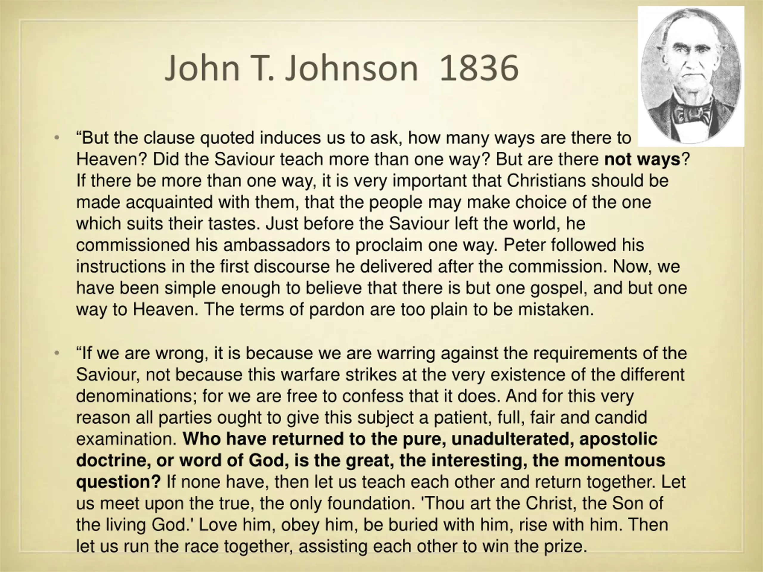 John T. Johnson 1836 But the clause quoted induces us to ask, how many ways are there to Heaven? Did the Saviour teach more than one way? But are there not ways? If there be more than one way, it is very important that Christians should be made acquainted with them, that the people may make choice of the one which suits their tastes. Just before the Saviour left the world, he commissioned his ambassadors to proclaim one way. Peter followed his instructions in the first discourse he delivered after the commission. Now, we have been simple enough to believe that there is but one gospel, and but one way to Heaven. The terms of pardon are too plain to be mistaken. If we are wrong, it is because we are warring against the requirements of the Saviour, not because this warfare strikes at the very existence of the different denominations; for we are free to confess that it does. And for this very reason all parties ought to give this subject a patient, full, fair and candid examination. Who have returned to the pure, unadulterated, apostolic doctrine, or word of God, is the great, the interesting, the momentous question? If none have, then let us teach each other and return together. Let us meet upon the true, the only foundation. 'Thou art the Christ, the Son of the living God.' Love him, obey him, be buried with him, rise with him. Then let us run the race together, assisting each other to win the prize.