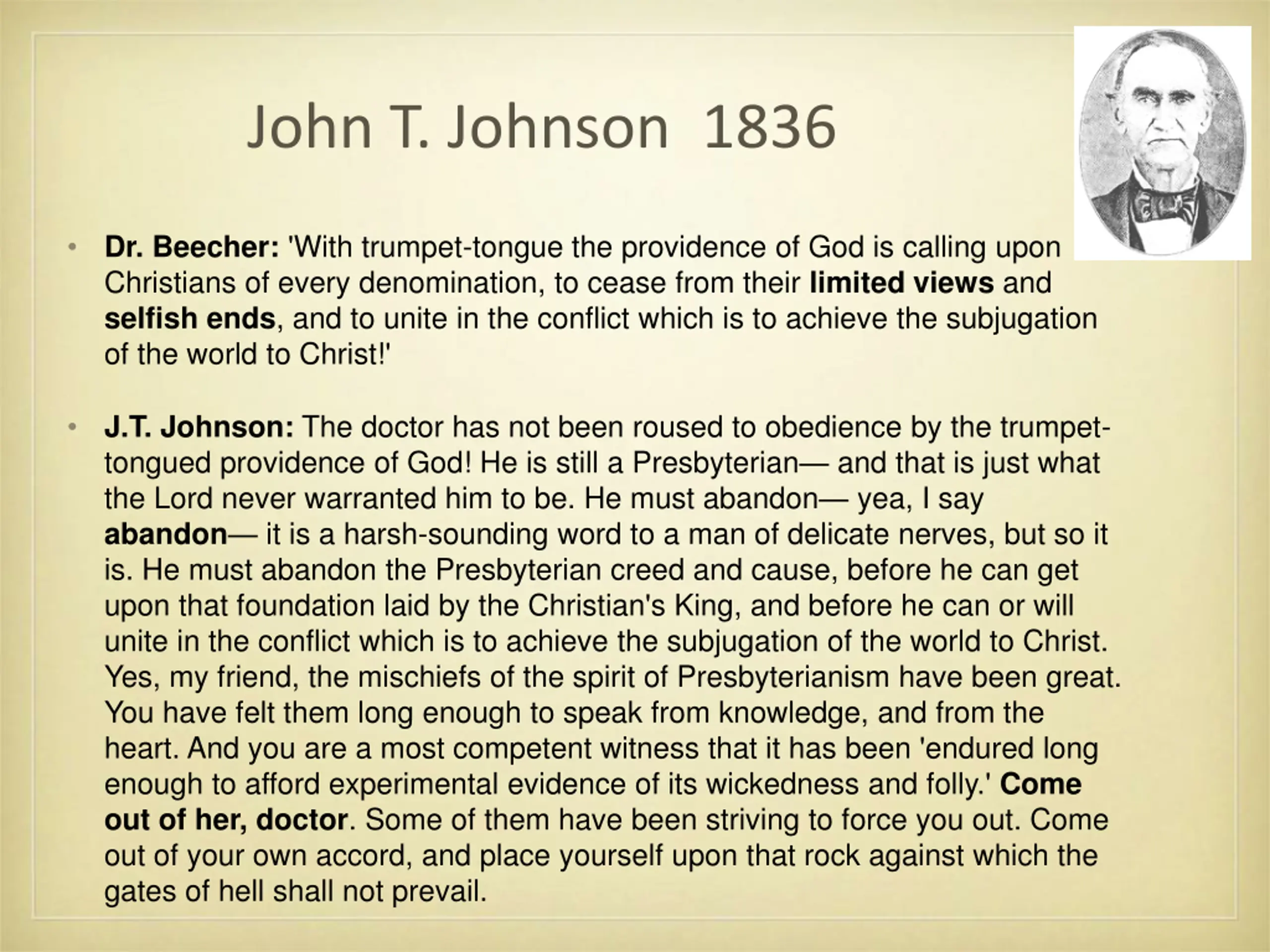 John T. Johnson 1836 Dr. Beecher: 'With trumpet-tongue the providence of God is calling upon Christians of every denomination, to cease from their limited views and selfish ends, and to unite in the conflict which is to achieve the subjugation of the world to Christ!' J.T. Johnson: The doctor has not been roused to obedience by the trumpet- tongued providence of God! He is still a Presbyterian and that is just what the Lord never warranted him to be. He must abandon yea, I say abandon it is a harsh-sounding word to a man of delicate nerves, but so it is. He must abandon the Presbyterian creed and cause, before he can get upon that foundation laid by the Christian's King, and before he can or will unite in the conflict which is to achieve the subjugation of the world to Christ. Yes, my friend, the mischiefs of the spirit of Presbyterianism have been great. You have felt them long enough to speak from knowledge, and from the heart. And you are a most competent witness that it has been 'endured long enough to afford experimental evidence of its wickedness and folly.' Come out of her, doctor. Some of them have been striving to force you out. Come out of your own accord, and place yourself upon that rock against which the gates of hell shall not prevail.
