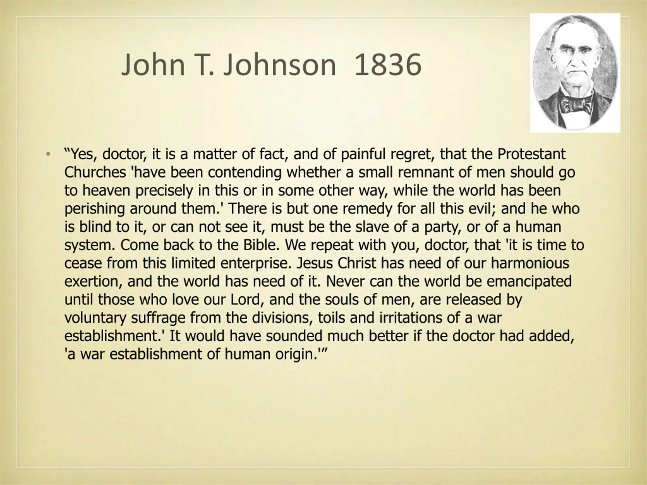 John T. Johnson 1836 Yes, doctor, it is a matter of fact, and of painful regret, that the Protestant Churches 'have been contending whether a small remnant of men should go to heaven precisely in this or in some other way, while the world has been perishing around them.' There is but one remedy for all this evil; and he who is blind to it, or can not see it, must be the slave of a party, or of a human system. Come back to the Bible. We repeat with you, doctor, that 'it is time to cease from this limited enterprise. Jesus Christ has need of our harmonious exertion, and the world has need of it. Never can the world be emancipated until those who love our Lord, and the souls of men, are released by voluntary suffrage from the divisions, toils and irritations of a war establishment.' It would have sounded much better if the doctor had added, 'a war establishment of human origin.'