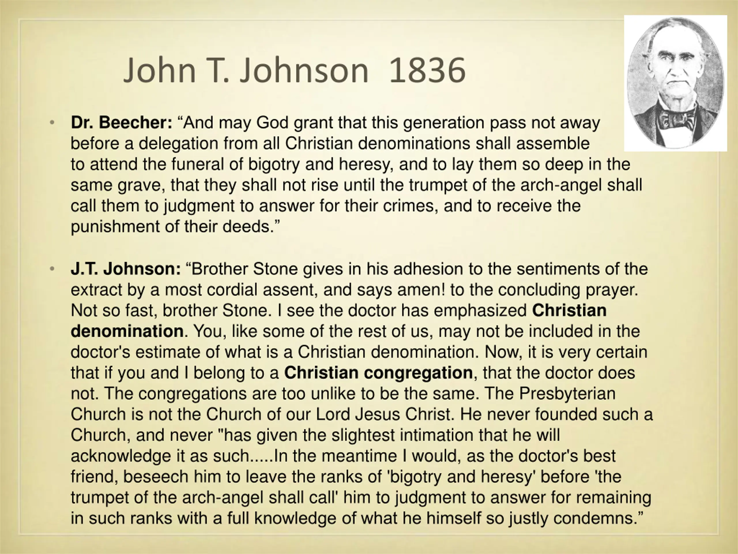 John T. Johnson 1836 Dr. Beecher: And may God grant that this generation pass not away before a delegation from all Christian denominations shall assemble to attend the funeral of bigotry and heresy, and to lay them so deep in the same grave, that they shall not rise until the trumpet of the arch-angel shall call them to judgment to answer for their crimes, and to receive the punishment of their deeds. J.T. Johnson: Brother Stone gives in his adhesion to the sentiments of the extract by a most cordial assent, and says amen! to the concluding prayer. Not so fast, brother Stone. I see the doctor has emphasized Christian denomination. You, like some of the rest of us, may not be included in the doctor's estimate of what is a Christian denomination. Now, it is very certain that if you and I belong to a Christian congregation, that the doctor does not. The congregations are too unlike to be the same. The Presbyterian Church is not the Church of our Lord Jesus Christ. He never founded such a Church, and never "has given the slightest intimation that he will acknowledge it as such.....In the meantime I would, as the doctor's best friend, beseech him to leave the ranks of 'bigotry and heresy' before 'the trumpet of the arch-angel shall call' him to judgment to answer for remaining in such ranks with a full knowledge of what he himself so justly condemns.