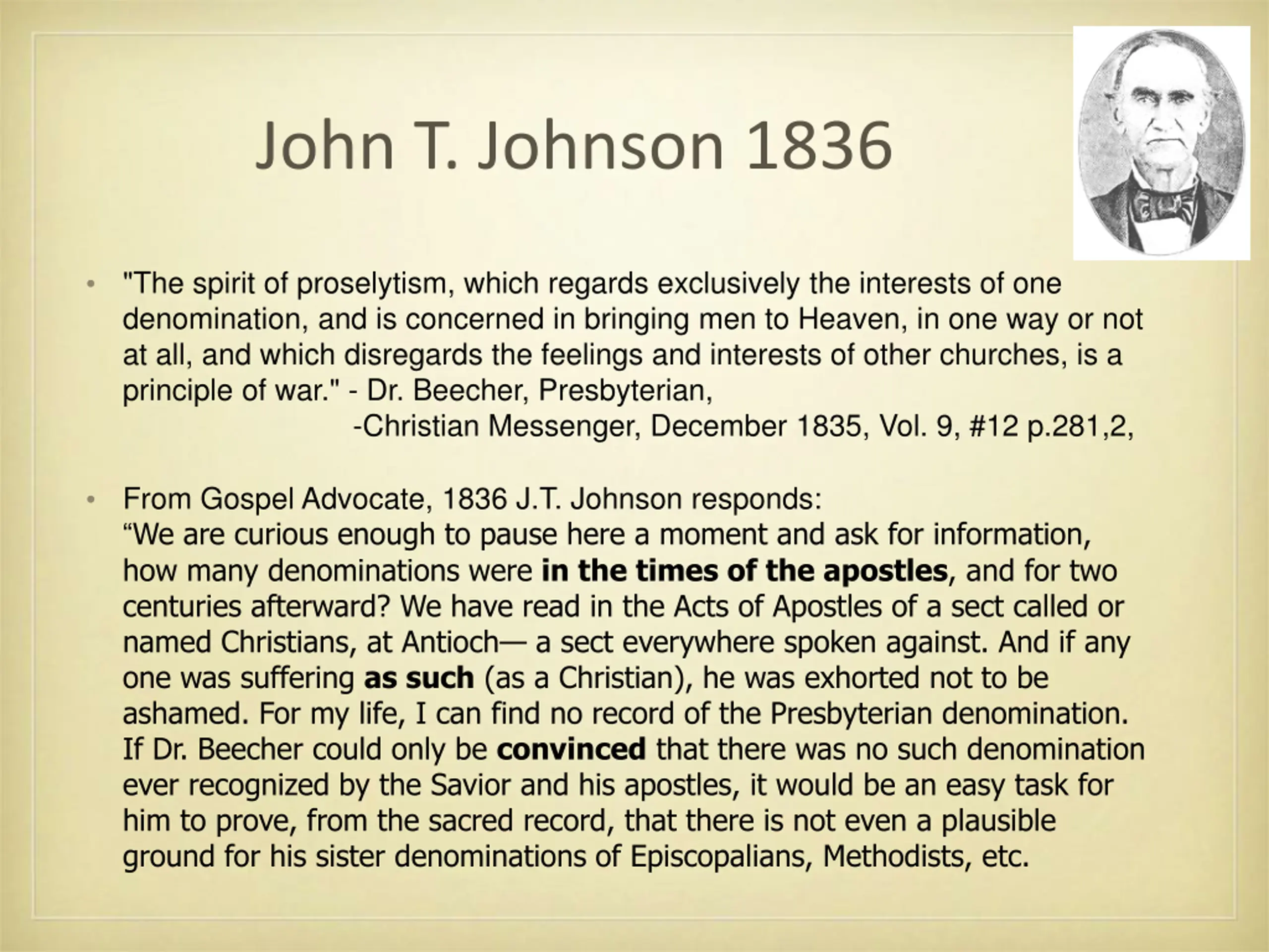 John T. Johnson 1836 "The spirit of proselytism, which regards exclusively the interests of one denomination, and is concerned in bringing men to Heaven, in one way or not at all, and which disregards the feelings and interests of other churches, is a principle of war." - Dr. Beecher, Presbyterian, -Christian Messenger, December 1835, Vol. 9, #12 p.281,2, From Gospel Advocate, 1836 J.T. Johnson responds: We are curious enough to pause here a moment and ask for information, how many denominations were in the times of the apostles, and for two centuries afterward? We have read in the Acts of Apostles of a sect called or named Christians, at Antioch a sect everywhere spoken against. And if any one was suffering as such (as a Christian), he was exhorted not to be ashamed. For my life, I can find no record of the Presbyterian denomination. If Dr. Beecher could only be convinced that there was no such denomination ever recognized by the Savior and his apostles, it would be an easy task for him to prove, from the sacred record, that there is not even a plausible ground for his sister denominations of Episcopalians, Methodists, etc.