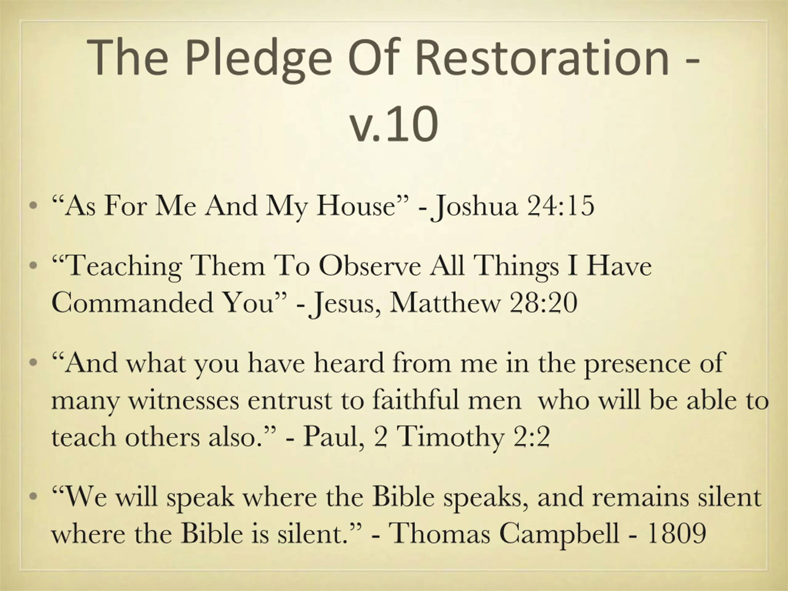 The Pledge Of Restoration - v.10 As For Me And My House - Joshua 24:15 Teaching Them To Observe All Things I Have Commanded You - Jesus, Matthew 28:20 And what you have heard from me in the presence of many witnesses entrust to faithful men who will be able to teach others also. - Paul, 2 Timothy 2:2 We will speak where the Bible speaks, and remains silent where the Bible is silent. - Thomas Campbell - 1809