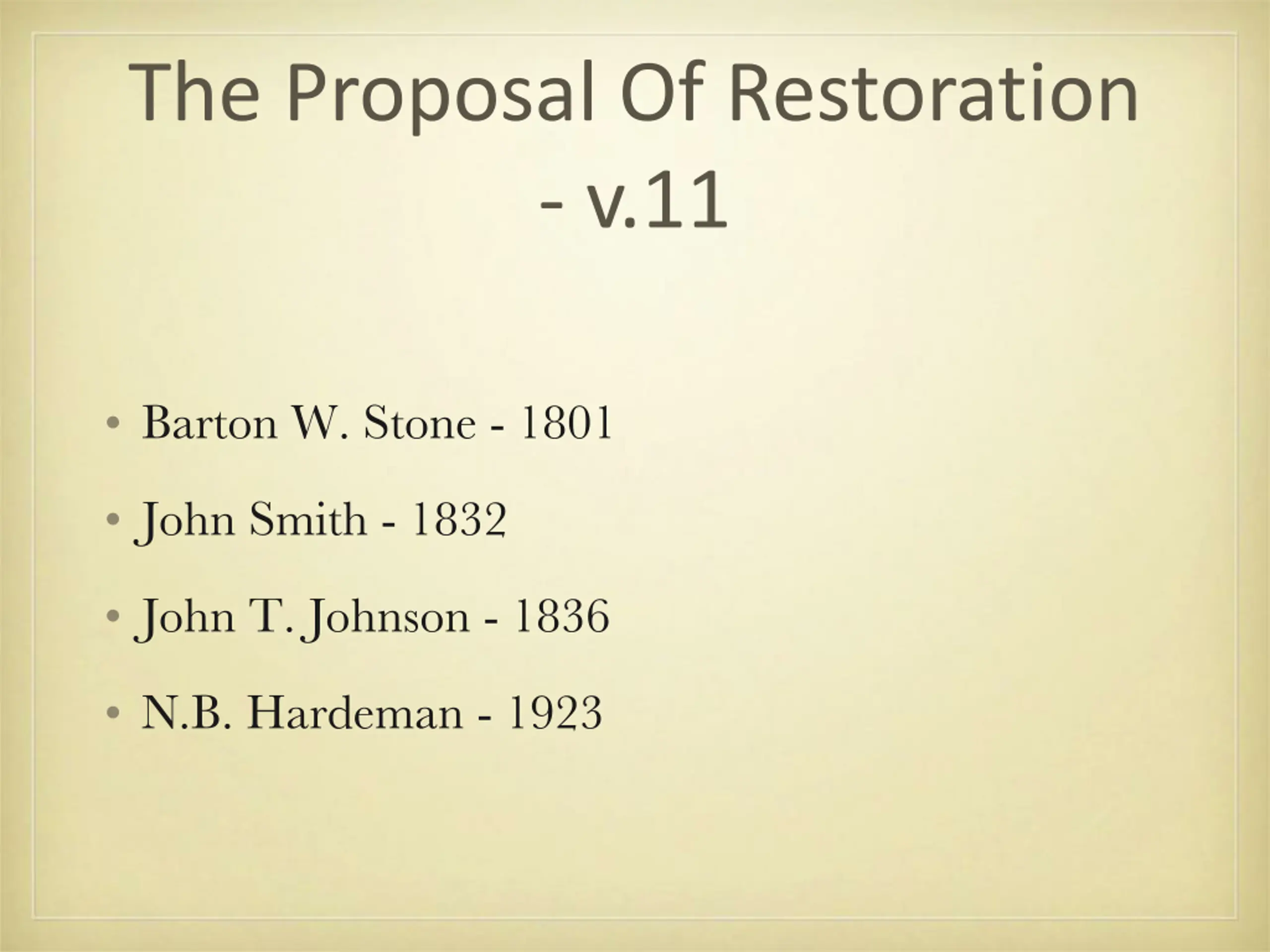 The Proposal Of Restoration - v.11 Barton W. Stone - 1801 John Smith - 1832 John T. Johnson - 1836 N.B. Hardeman - 1923