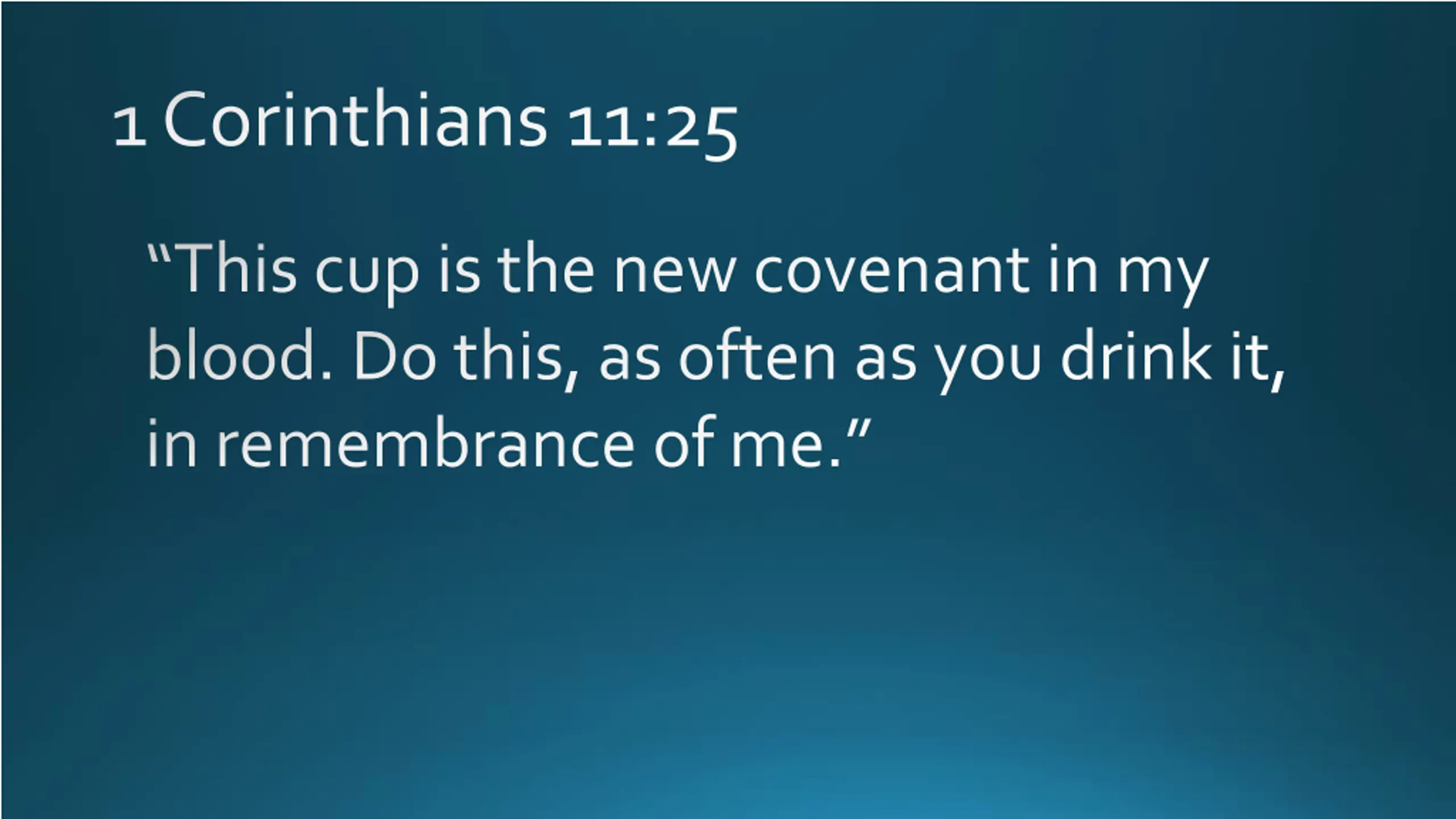 1 Corinthians 11:25 This cup is the new covenant in my blood. Do this, as often as you drink it, in remembrance of me.