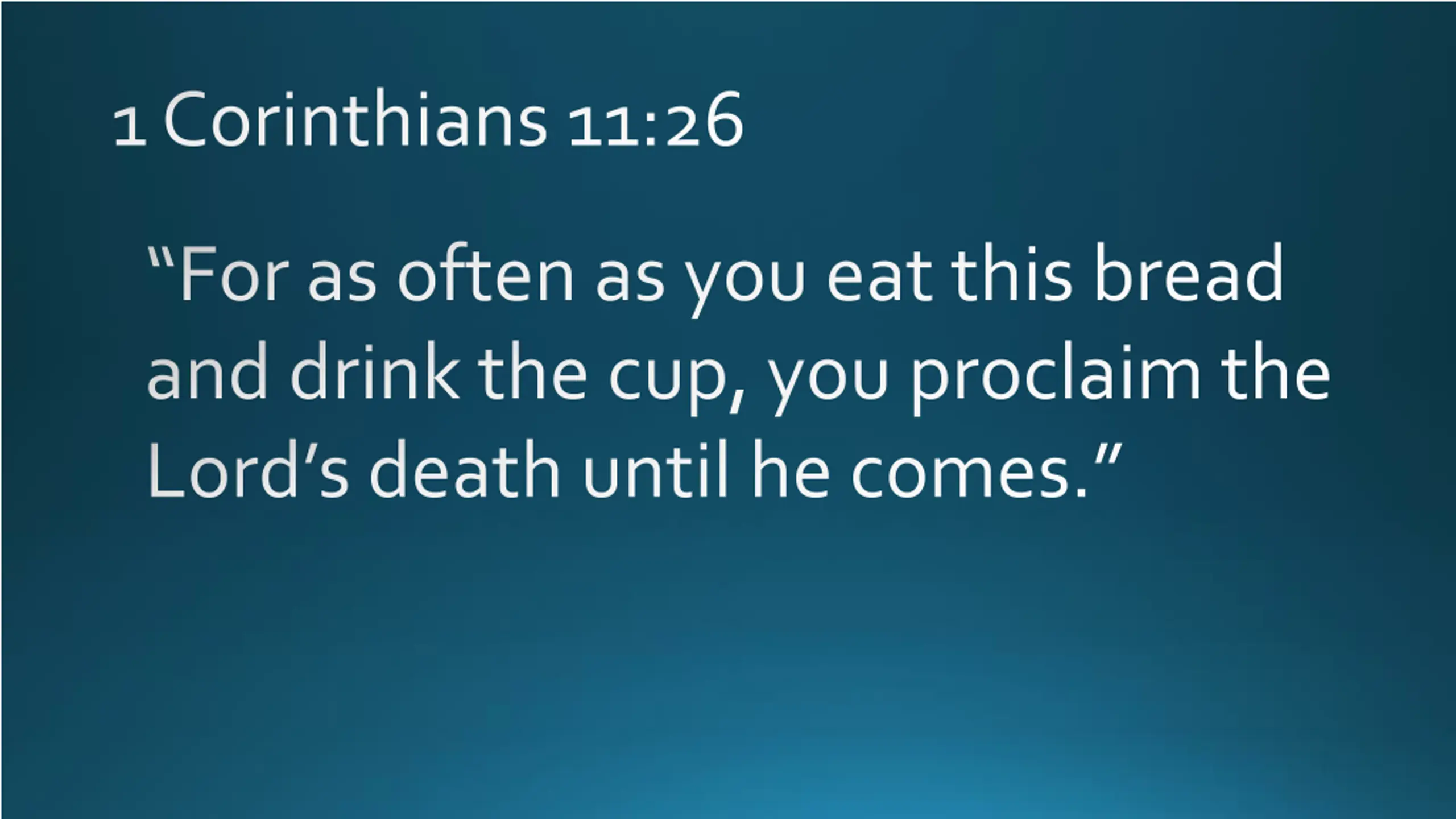 1 Corinthians 11:26 For as often as you eat this bread and drink the cup, you proclaim the Lord s death until he comes.
