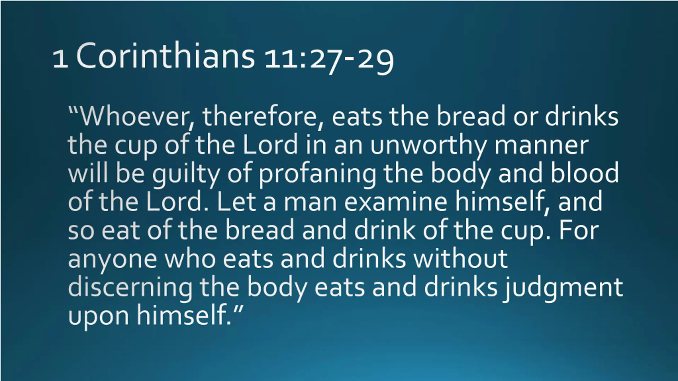 1 Corinthians 11:27-29 Whoever, therefore, eats the bread or drinks the cup of the Lord in an unworthy manner will be guilty of profaning the body and blood of the Lord. Let a man examine himself, and so eat of the bread and drink of the cup. For anyone who eats and drinks without discerning the body eats and drinks judgment upon himself.