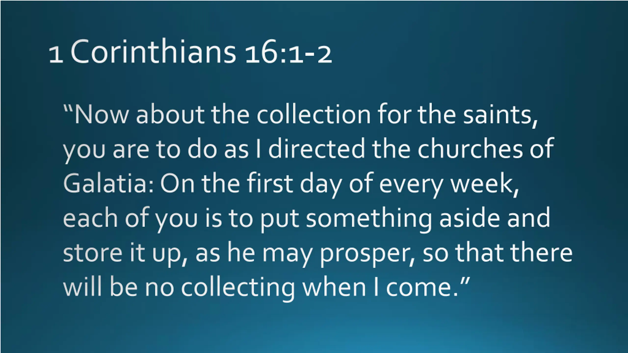 1 Corinthians 16:1-2 Now about the collection for the saints, you are to do as I directed the churches of Galatia: On the first day of every week, each of you is to put something aside and store it up, as he may prosper, so that there will be no collecting when I come.