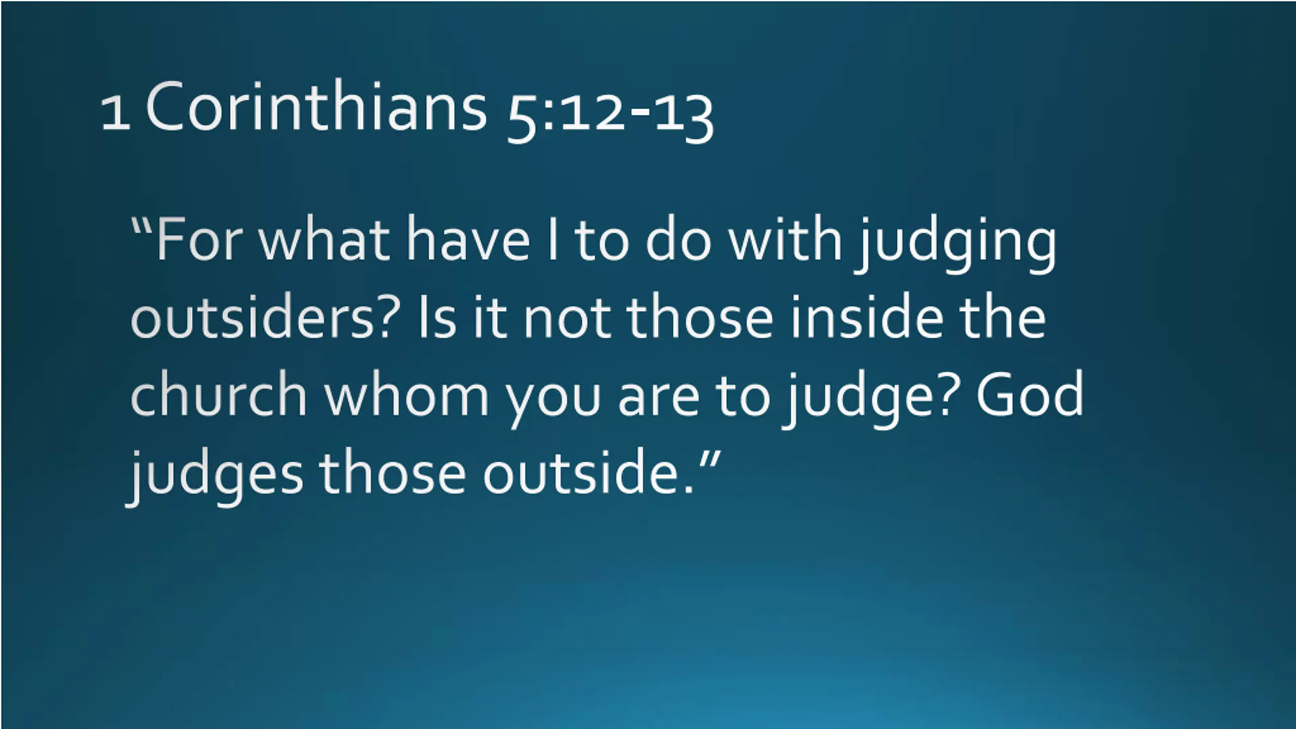 1 Corinthians 5:12-13 For what have I to do with judging outsiders? Is it not those inside the church whom you are to judge? God judges those outside.