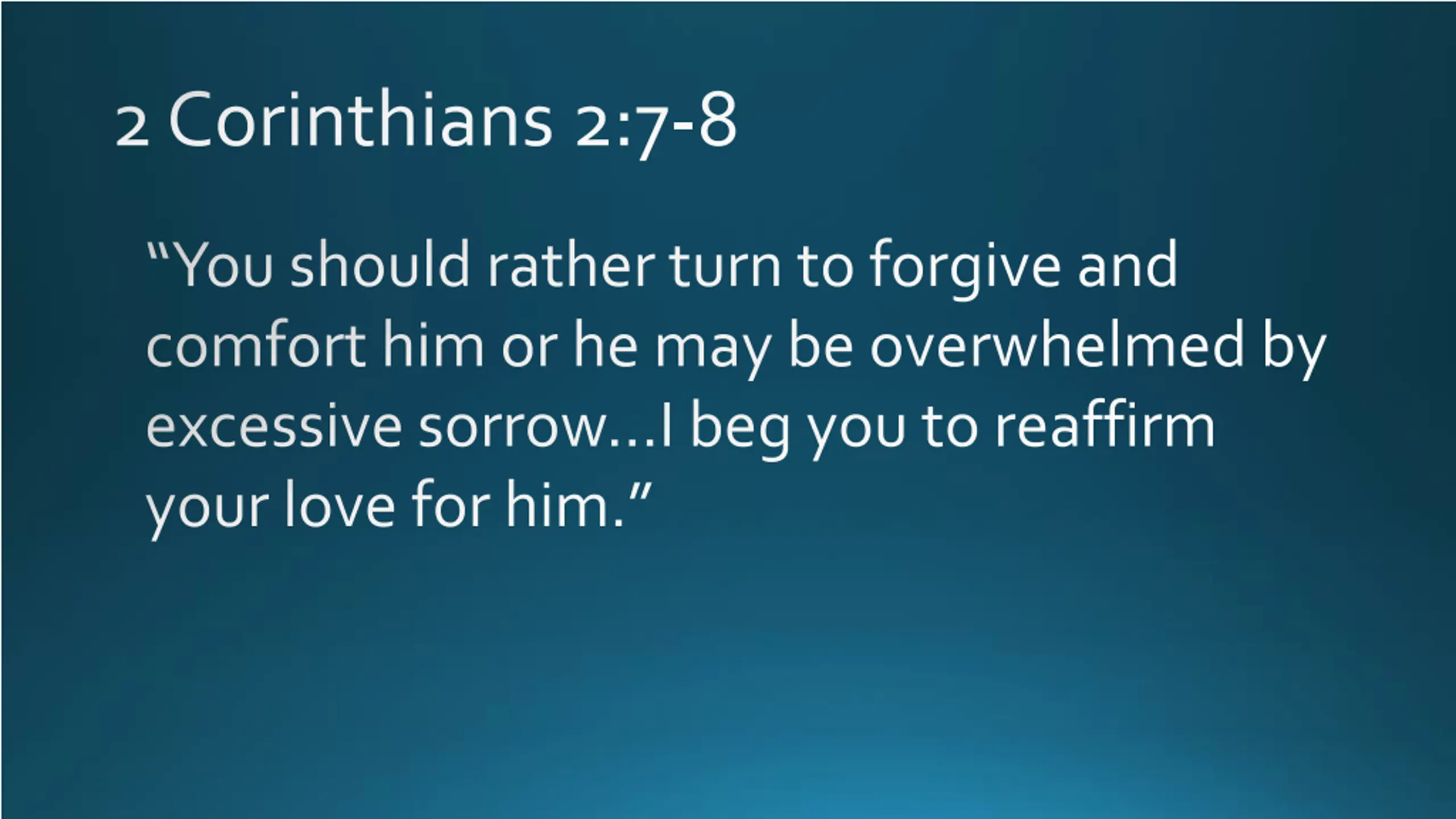 2 Corinthians 2:7-8 You should rather turn to forgive and comfort him or he may be overwhelmed by excessive sorrow I beg you to reaffirm your love for him.