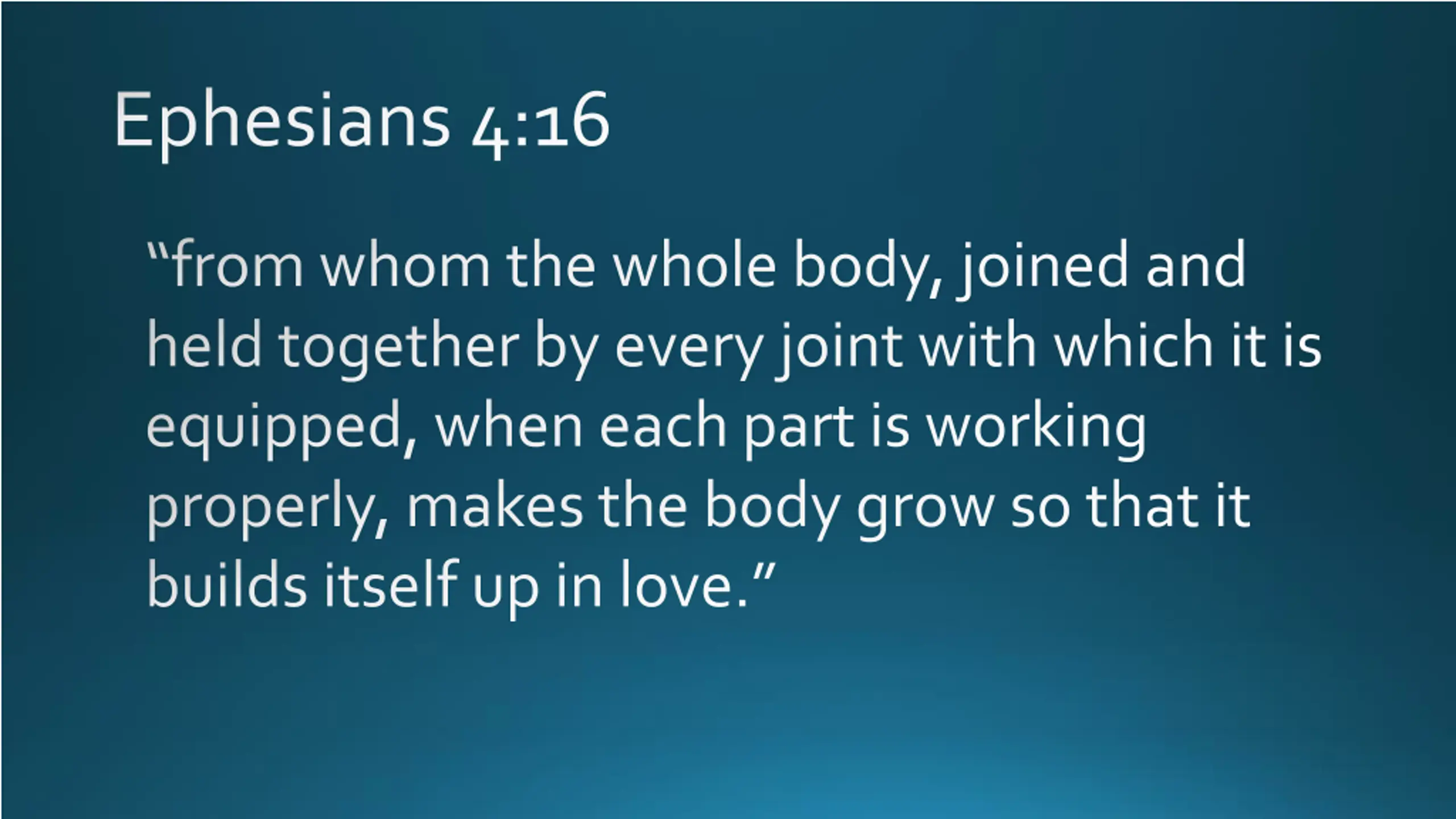 Ephesians 4:16 from whom the whole body, joined and held together by every joint with which it is equipped, when each part is working properly, makes the body grow so that it builds itself up in love.
