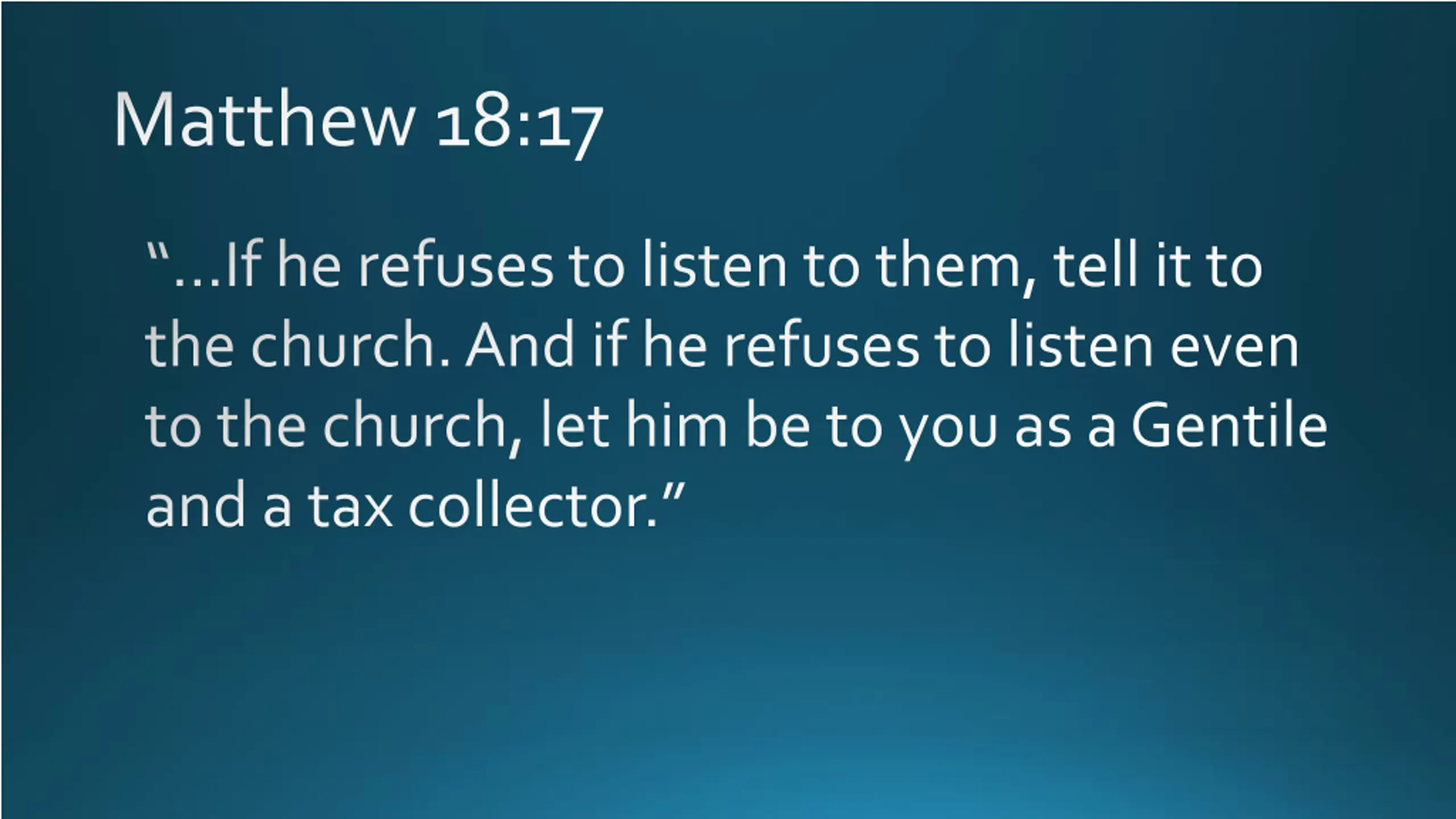 Matthew 18:17 If he refuses to listen to them, tell it to the church. And if he refuses to listen even to the church, let him be to you as a Gentile and a tax collector.