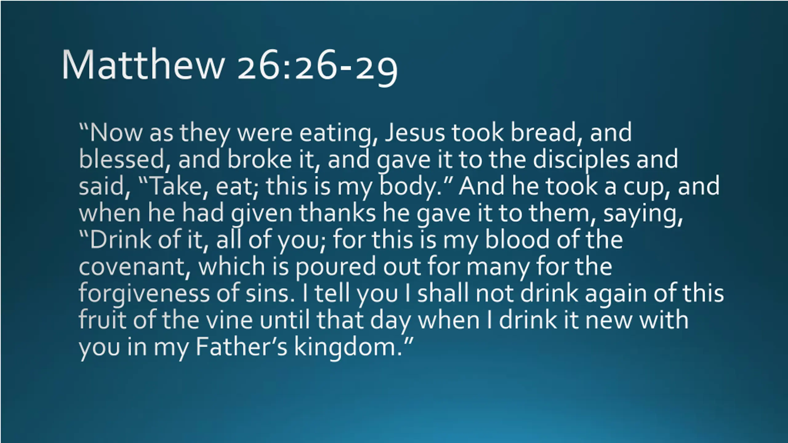 Matthew 26:26-29 Now as they were eating, Jesus took bread, and blessed, and broke it, and gave it to the disciples and said, Take, eat; this is my body. And he took a cup, and when he had given thanks he gave it to them, saying, Drink of it, all of you; for this is my blood of the covenant, which is poured out for many for the forgiveness of sins. I tell you I shall not drink again of this fruit of the vine until that day when I drink it new with you in my Father s kingdom.