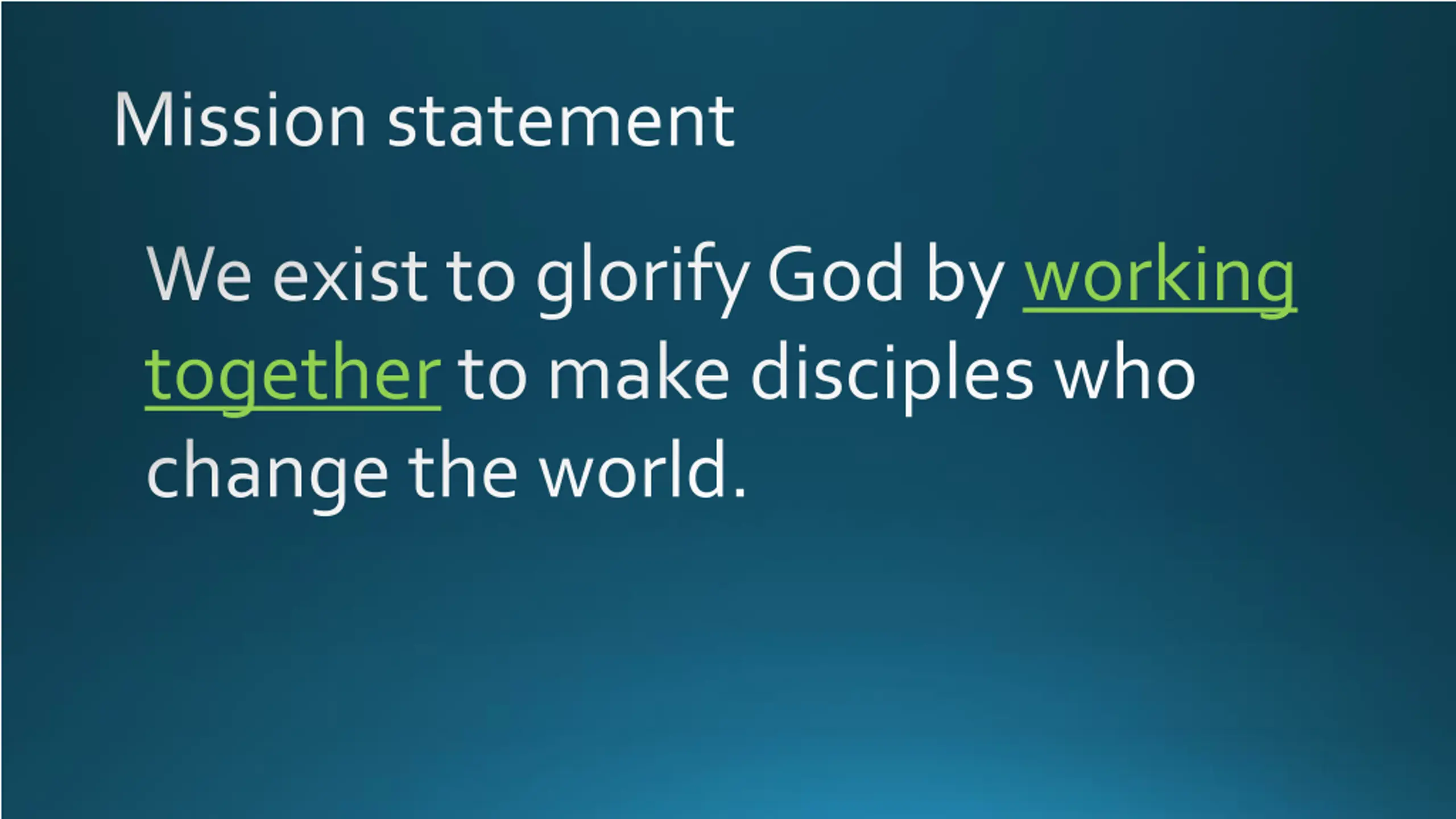 Mission statement We exist to glorify Godby working together to make disciples who change the world.
