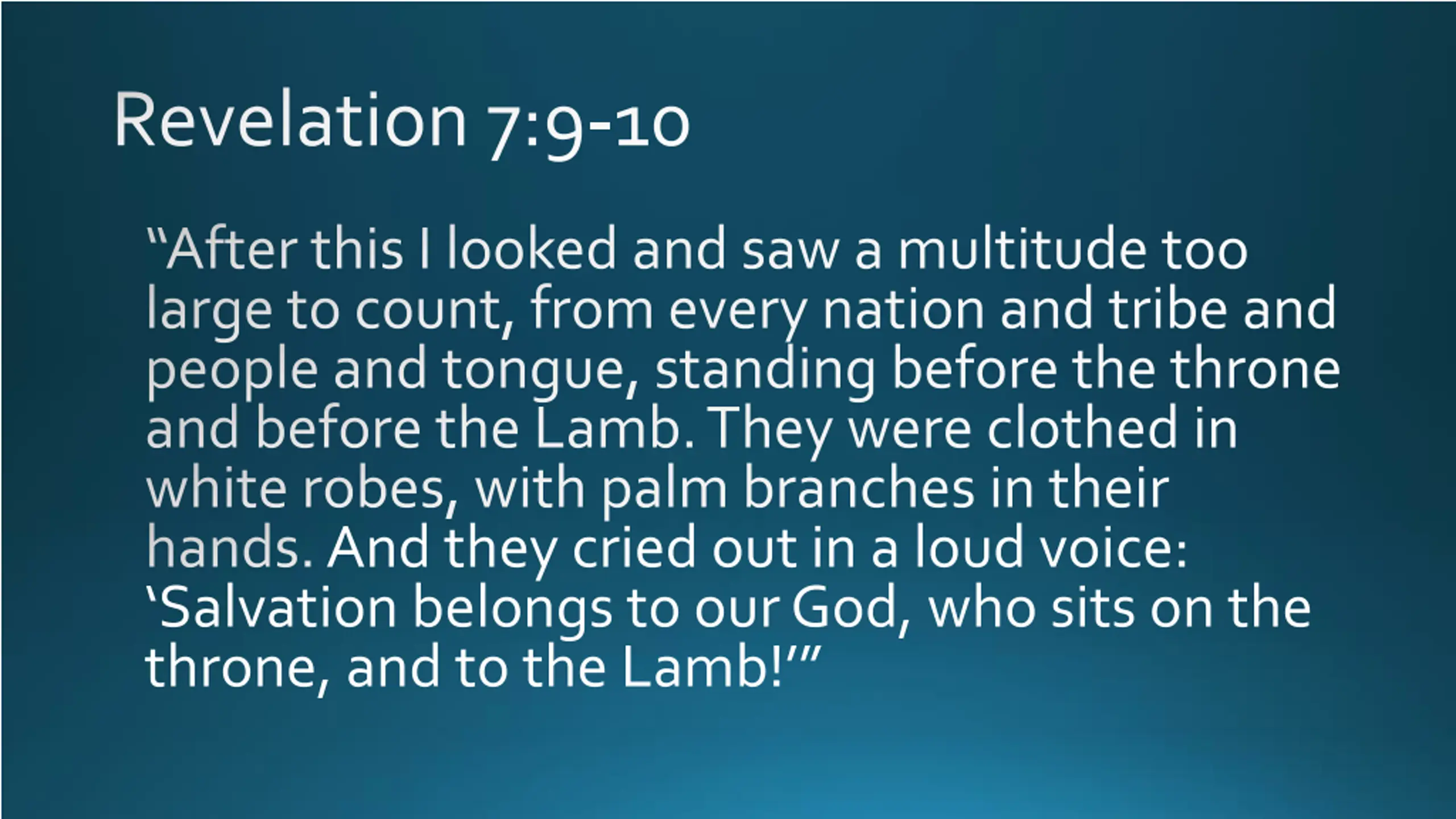 Revelation 7:9-10 After this I looked and saw a multitude too large to count, from every nation and tribe and people and tongue, standing before the throne and before the Lamb. They were clothed in white robes, with palm branches in their hands. And they cried out in a loud voice: Salvation belongs to our God, who sits on the throne, and to the Lamb!