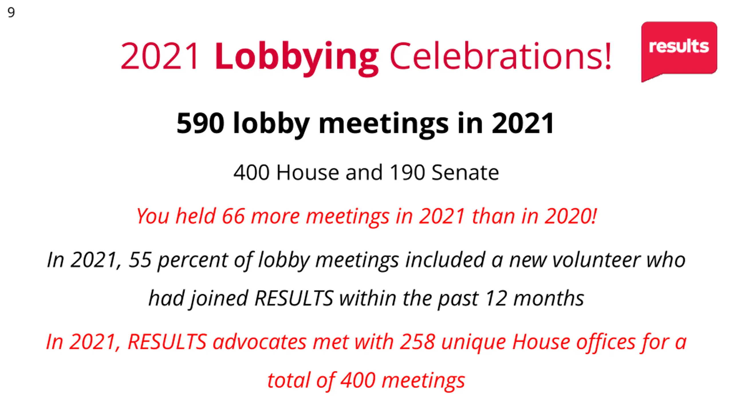 9 2021 Lobbying Celebrations! 590 lobby meetings in 2021 400 House and 190 Senate You held 66 more meetings in 2021 than in 2020! In 2021, 55 percent of lobby meetings included a new volunteer who had joined RESULTS within the past 12 months In 2021, RESULTS advocates met with 258 unique House offices for a total of 400 meetings