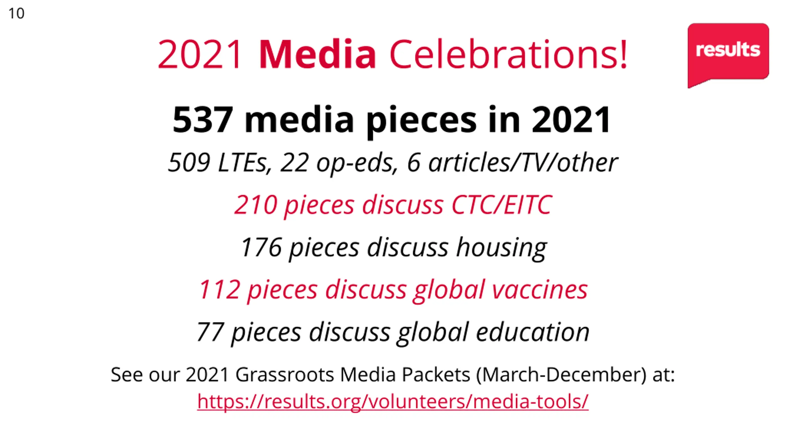 10 2021 Media Celebrations! 537 media pieces in 2021 509 LTEs, 22 op-eds, 6 articles/TV/other 210 pieces discuss CTC/EITC 176 pieces discuss housing 112 pieces discuss global vaccines 77 pieces discuss global education See our 2021 Grassroots Media Packets (March-December) at: https://results.org/volunteers/media-tools/