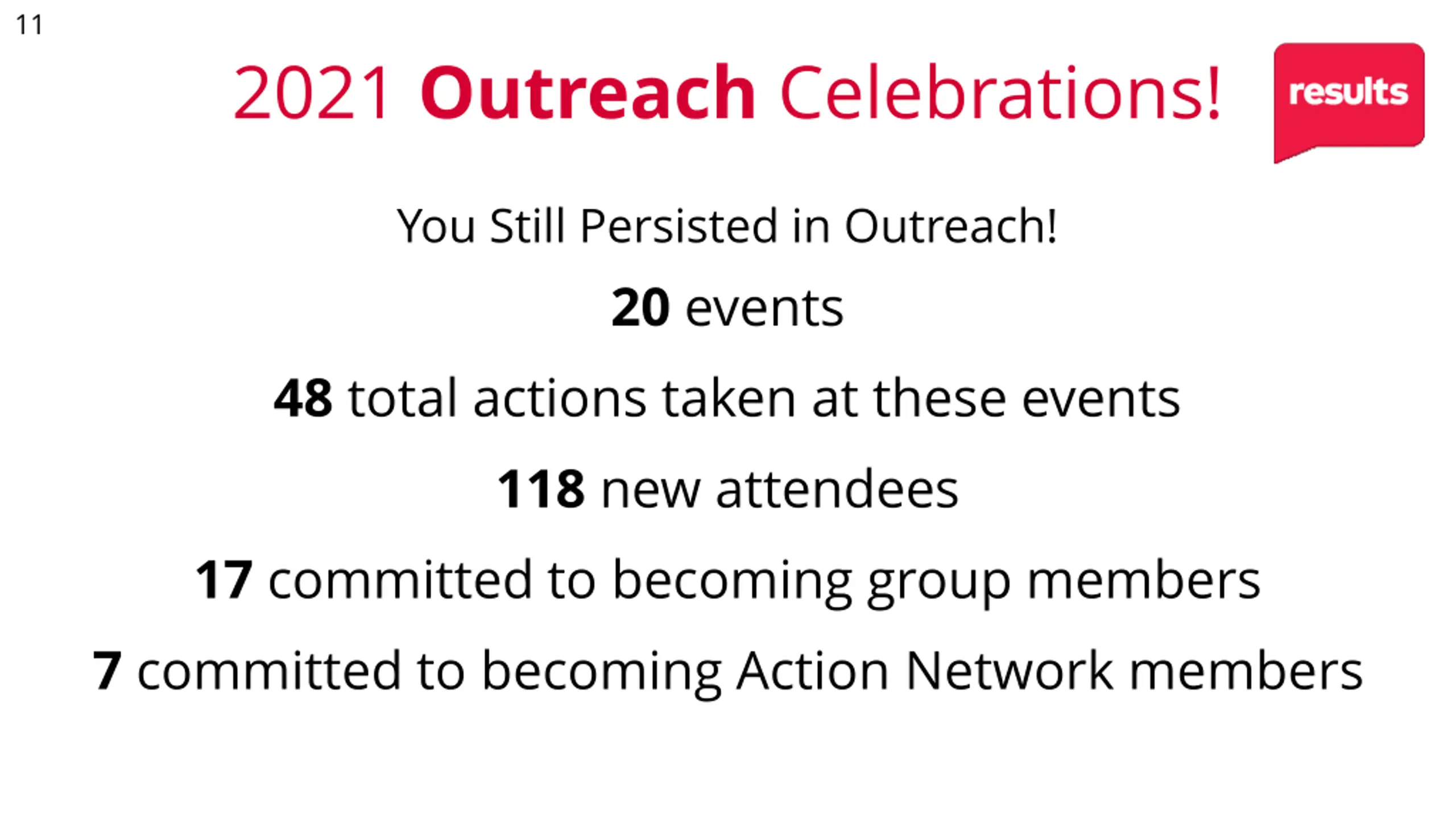 11 2021 Outreach Celebrations! You Still Persisted in Outreach! 20 events 48 total actions taken at these events 118 new attendees 17 committed to becoming group members 7 committed to becoming Action Network members