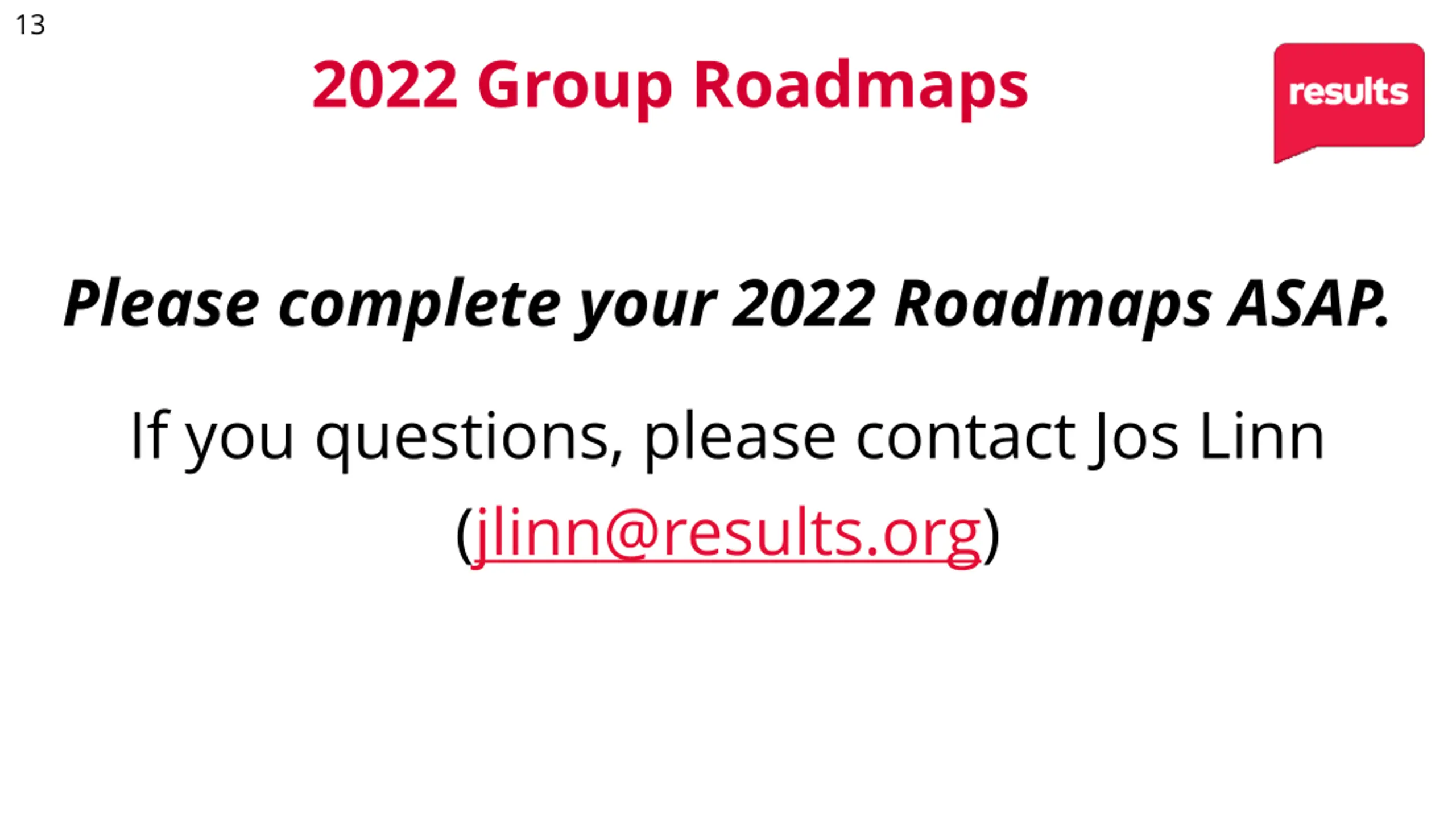 13 2022 Group Roadmaps Please complete your 2022 Roadmaps ASAP. If you questions, please contact Jos Linn (jlinn@results.org)