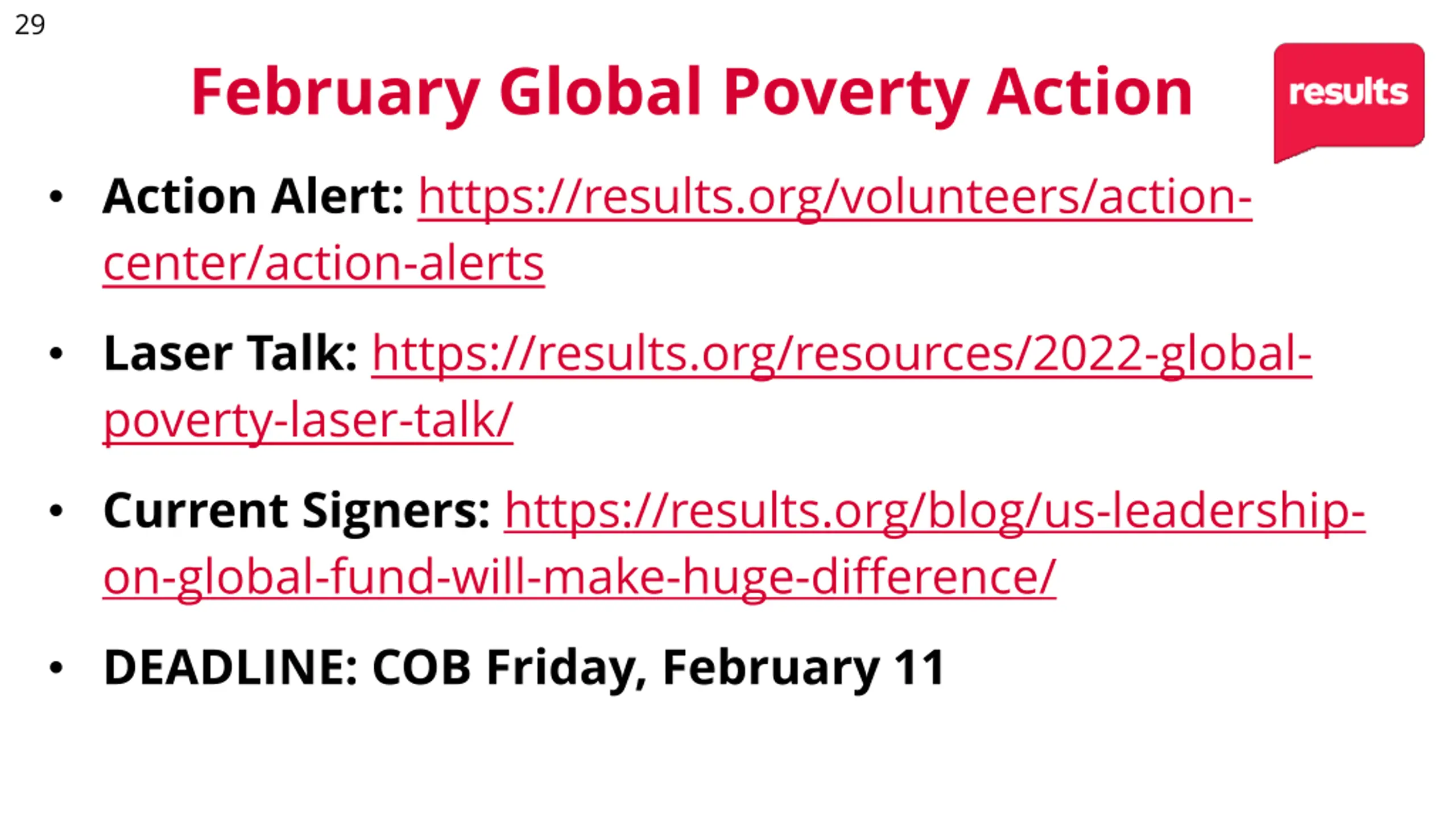 29 February Global Poverty Action Action Alert: https://results.org/volunteers/action- center/action-alerts Laser Talk: https://results.org/resources/2022-global- poverty-laser-talk/ Current Signers: https://results.org/blog/us-leadership- on-global-fund-will-make-huge-difference/ DEADLINE: COB Friday, February 11