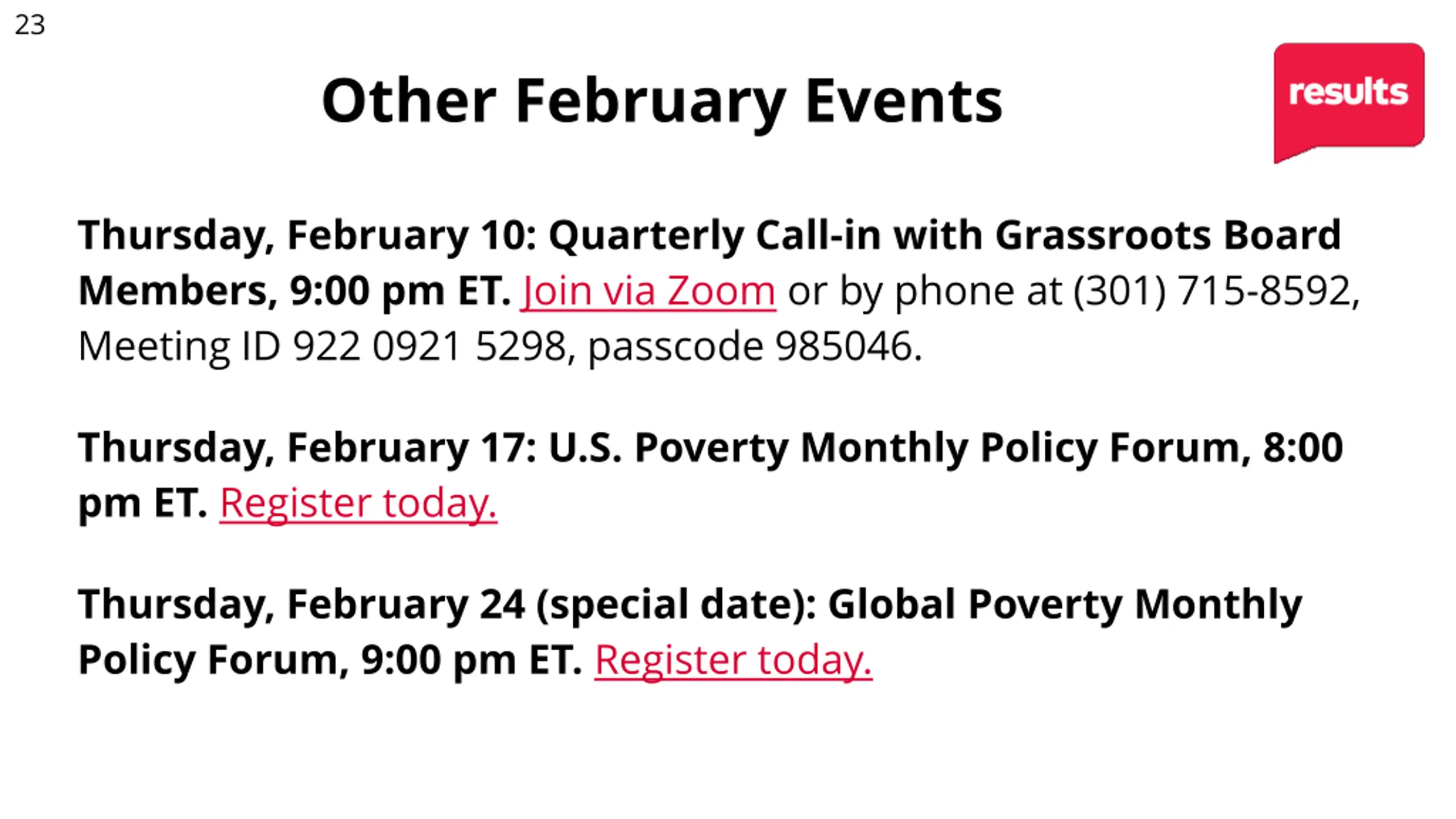 23 Other February Events Thursday, February 10: Quarterly Call-in with Grassroots Board Members, 9:00 pm ET. Join via Zoom or by phone at (301) 715-8592, Meeting ID 922 0921 5298, passcode 985046. Thursday, February 17: U.S. Poverty Monthly Policy Forum, 8:00 pm ET. Register today. Thursday, February 24 (special date): Global Poverty Monthly Policy Forum, 9:00 pm ET. Register today.