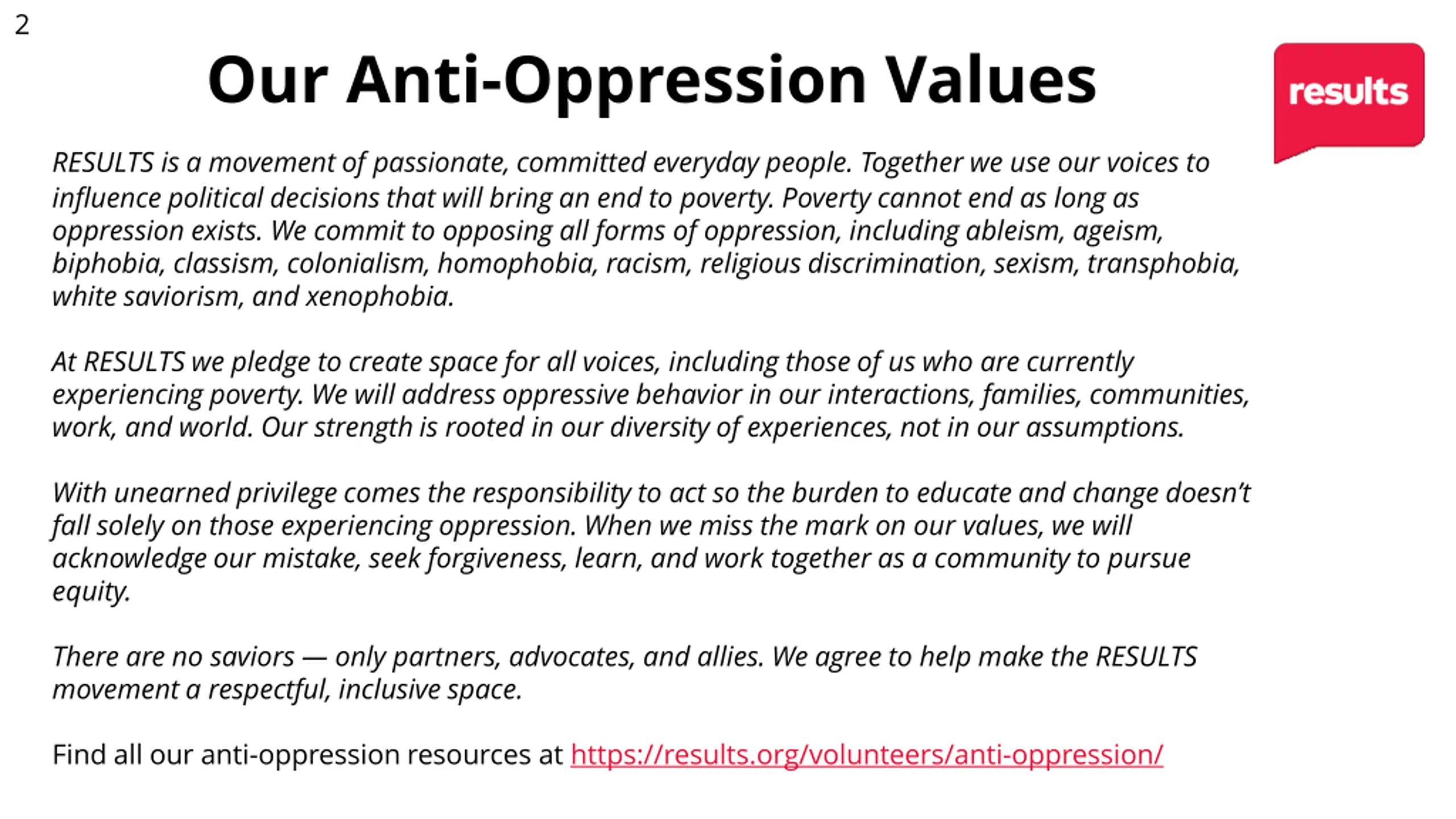 2 Our Anti-Oppression Values RESULTS is a movement of passionate, committed everyday people. Together we use our voices to influence political decisions that will bring an end to poverty. Poverty cannot end as long as oppression exists. We commit to opposing all forms of oppression, including ableism, ageism, biphobia, classism, colonialism, homophobia, racism, religious discrimination, sexism, transphobia, white saviorism, and xenophobia. At RESULTS we pledge to create space for all voices, including those of us who are currently experiencing poverty. We will address oppressive behavior in our interactions, families, communities, work, and world. Our strength is rooted in our diversity of experiences, not in our assumptions. With unearned privilege comes the responsibility to act so the burden to educate and change doesn t fall solely on those experiencing oppression. When we miss the mark on our values, we will acknowledge our mistake, seek forgiveness, learn, and work together as a community to pursue equity. There are no saviors only partners, advocates, and allies. We agree to help make the RESULTS movement a respectful, inclusive space. Find all our anti-oppression resources at https://results.org/volunteers/anti-oppression/