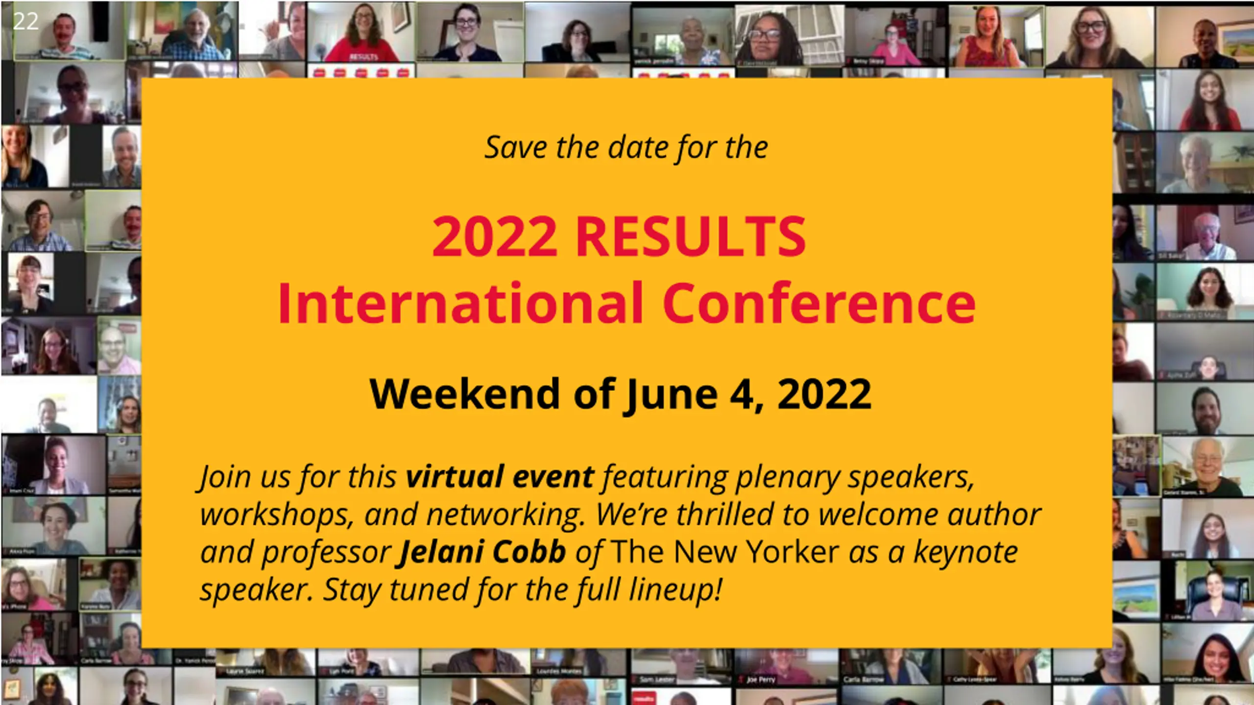 22 Save the date for the 2022 RESULTS International Conference Weekend of June 4, 2022 Join us for this virtual event featuring plenary speakers, workshops, and networking. We re thrilled to welcome author and professor Jelani Cobb of The New Yorker as a keynote speaker. Stay tuned for the full lineup!