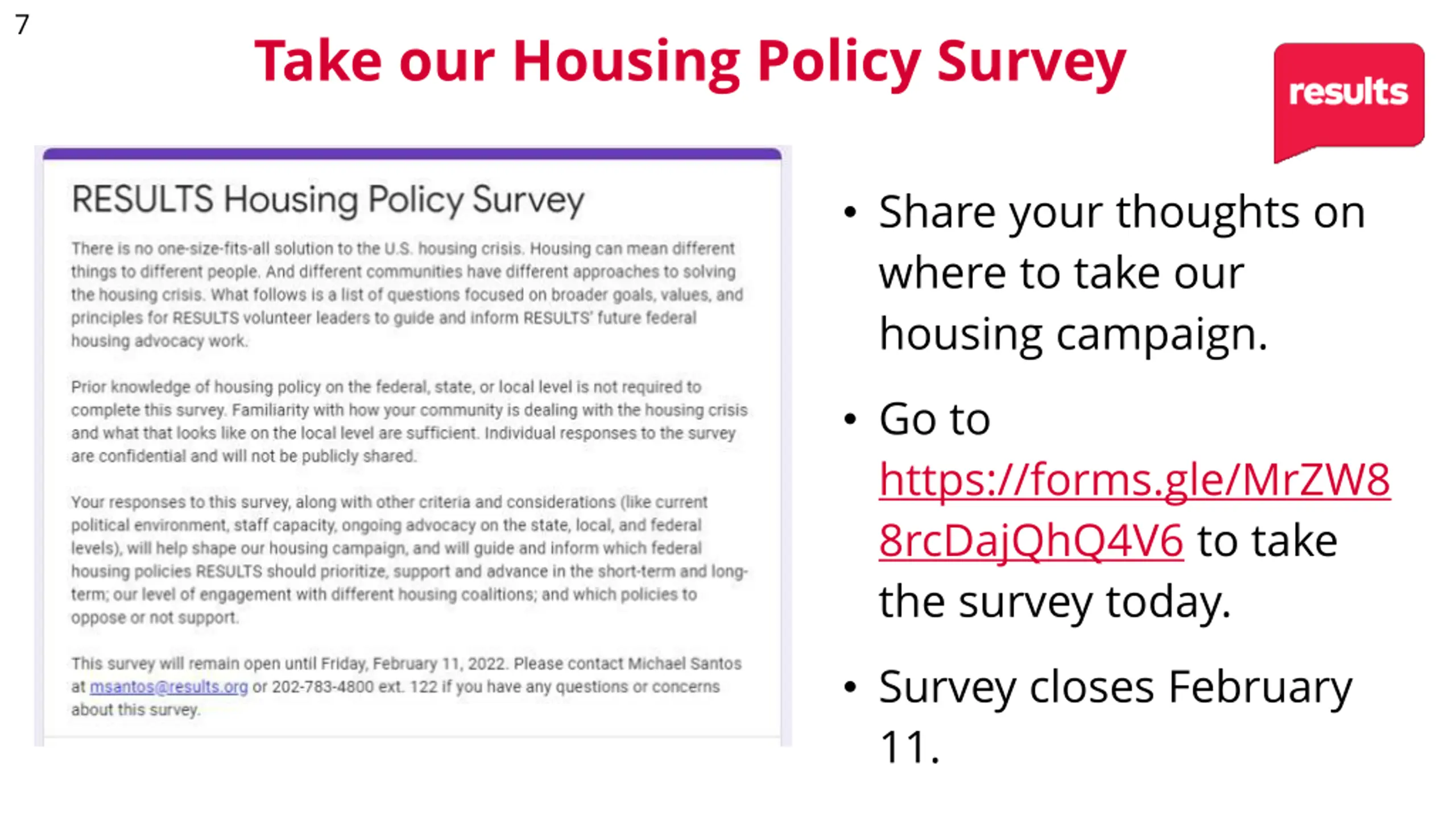 7 Take our Housing Policy Survey Share your thoughts on where to take our housing campaign. Go to https://forms.gle/MrZW8 8rcDajQhQ4V6 to take the survey today. Survey closes February 11.