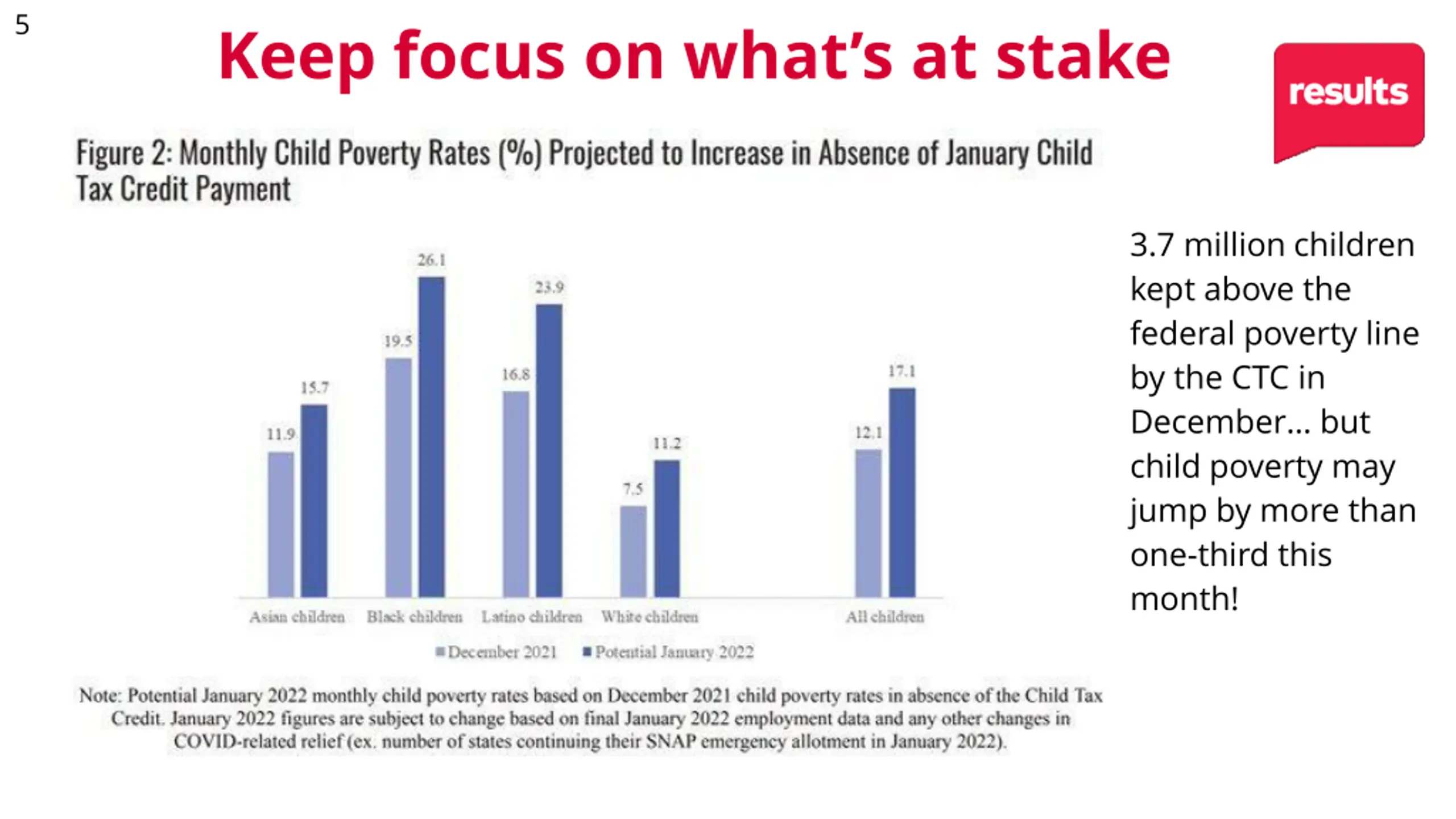 5 Keep focus on what s at stake 3.7 million children kept above the federal poverty line by the CTC in December but child poverty may jump by more than one-third this month!