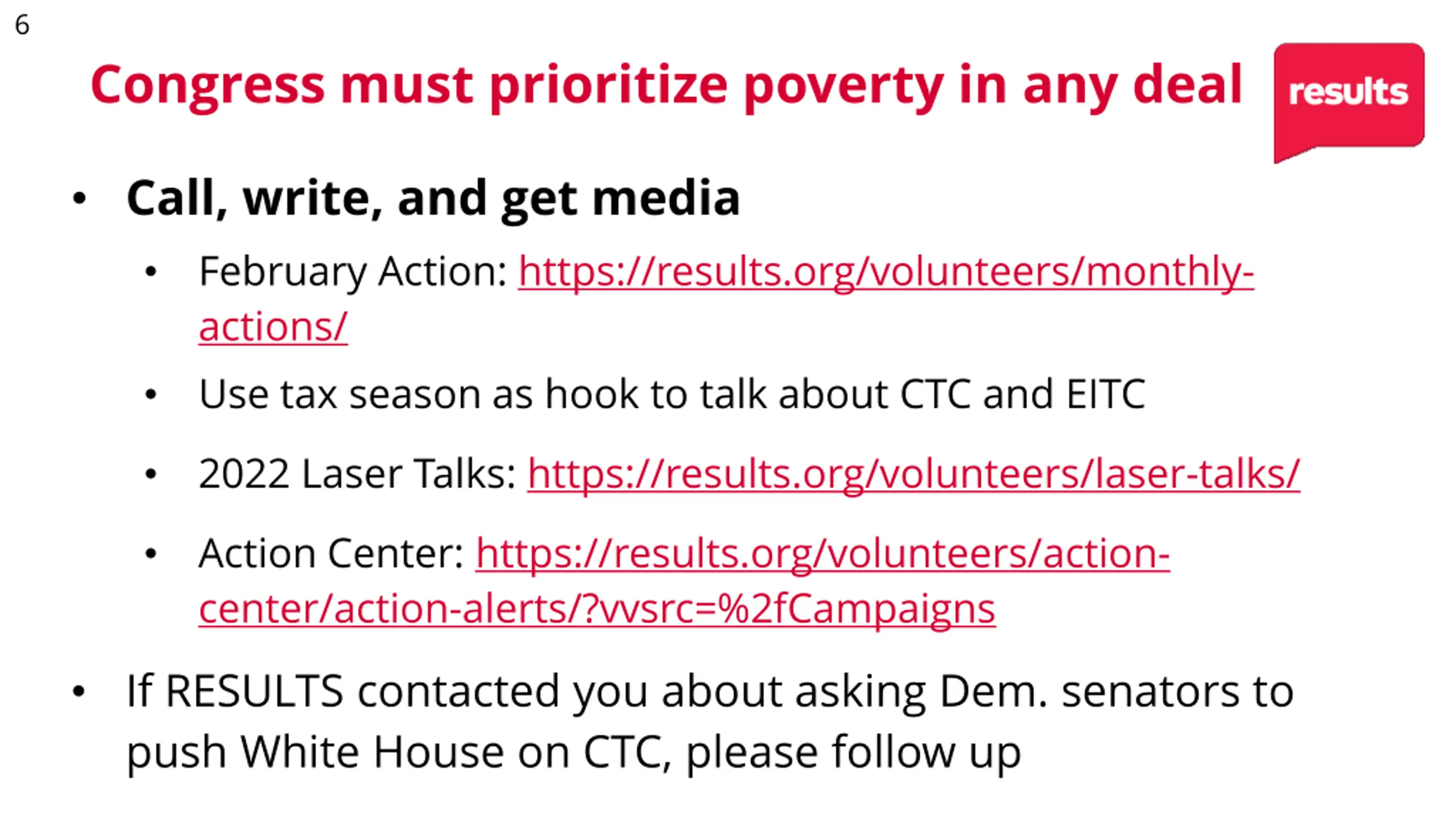 6 Congress must prioritize poverty in any deal Call, write, and get media February Action: https://results.org/volunteers/monthly- actions/ Use tax season as hook to talk about CTC and EITC 2022 Laser Talks: https://results.org/volunteers/laser-talks/ Action Center: https://results.org/volunteers/action- center/action-alerts/?vvsrc=%2fCampaigns If RESULTS contacted you about asking Dem. senators to push White House on CTC, please follow up