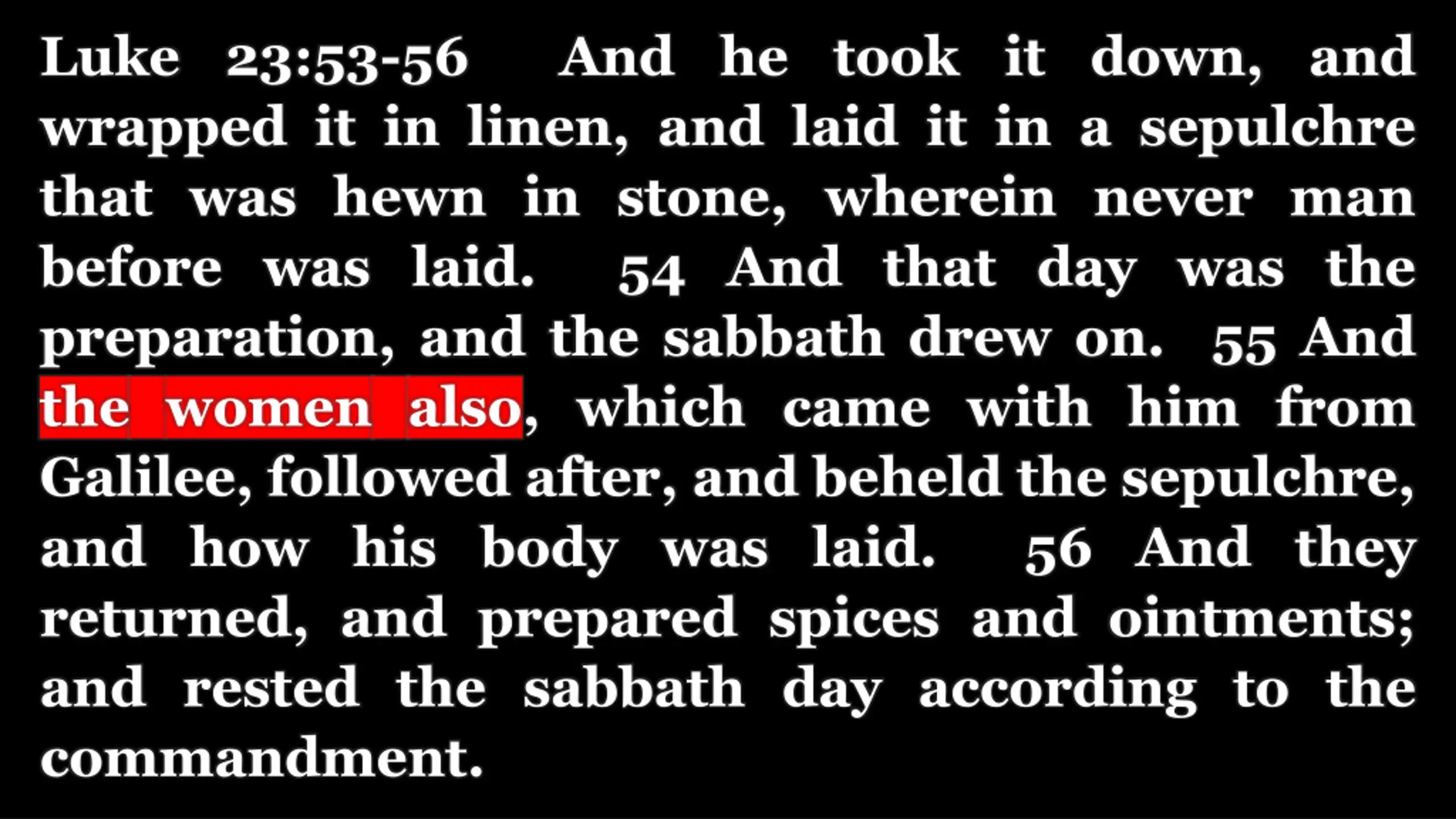 Luke 23:53-56 And he took it down, and wrapped it in linen, and laid it in a sepulchre that was hewn in stone, wherein never man before was laid. 54 And that day was the preparation, and the sabbath drew on. 55 And the women also, which came with him from Galilee, followed after, and beheld the sepulchre, and how his body was laid. 56 And they returned, and prepared spices and ointments; and rested the sabbath day according to the commandment.