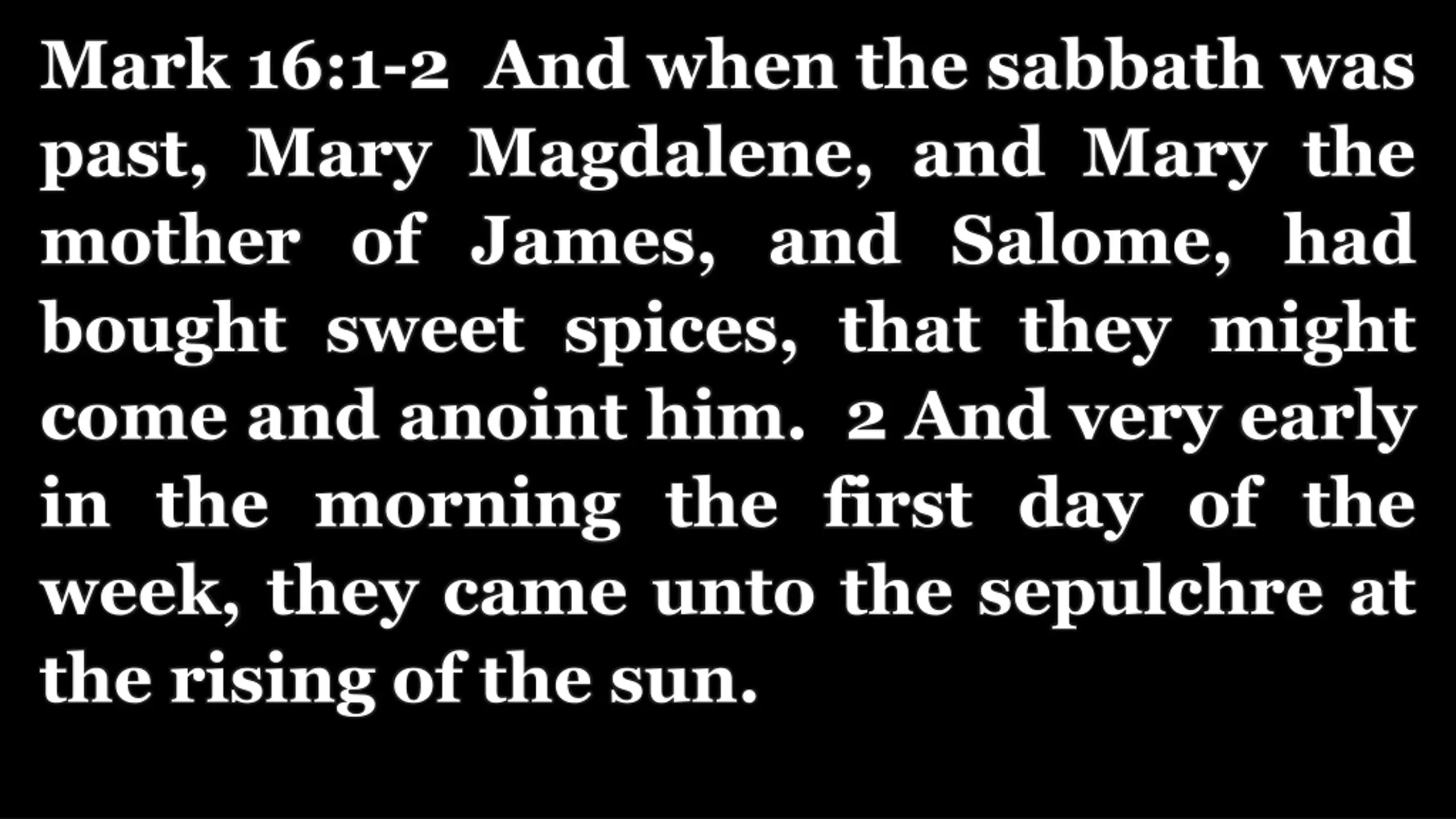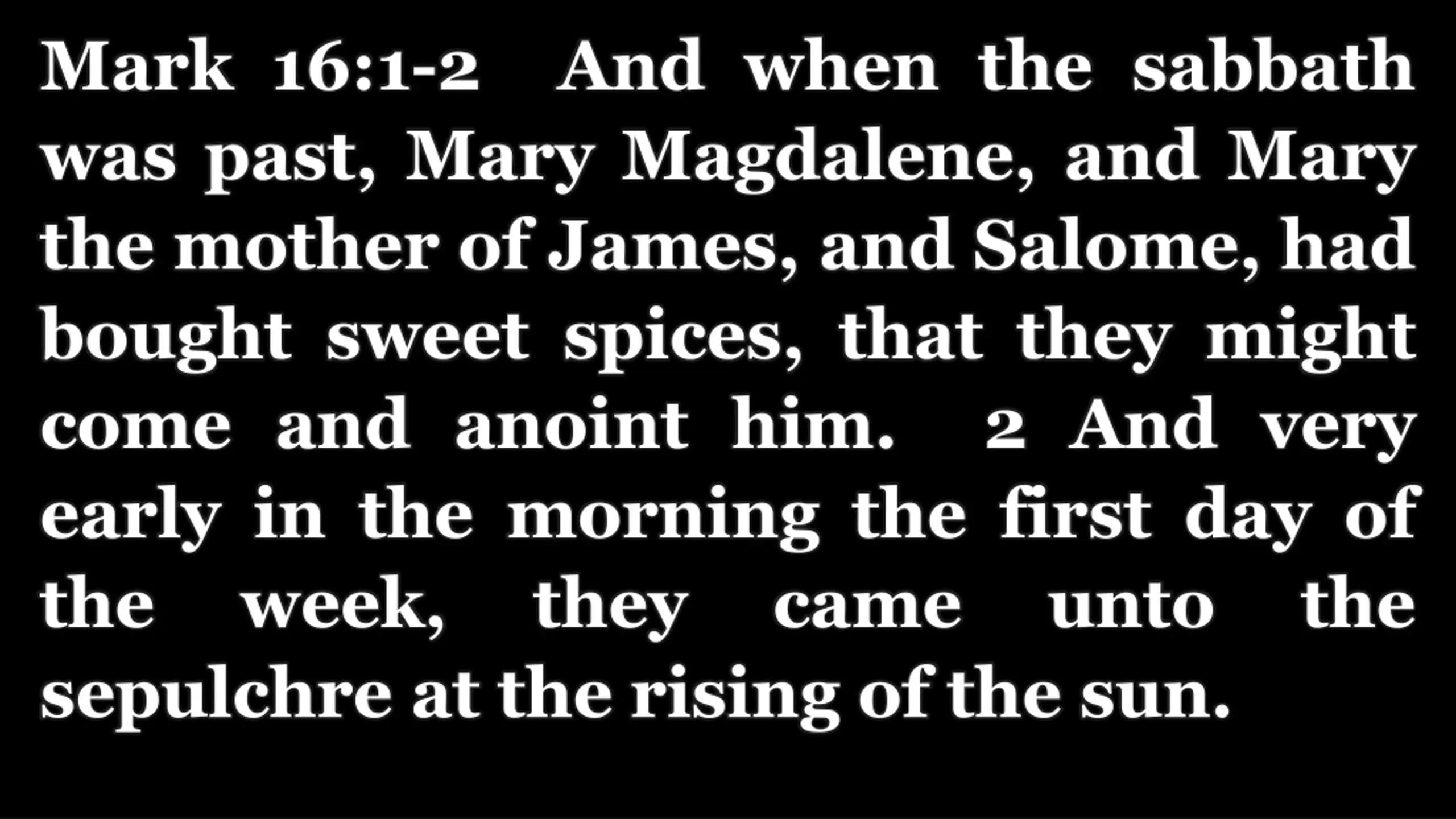 Mark 16:1-2 And when the sabbath was past, Mary Magdalene, and Mary the mother of James, and Salome, had bought sweet spices, that they might come and anoint him. 2 And very early in the morning the first day of the week, they came unto the sepulchre at the rising of the sun.