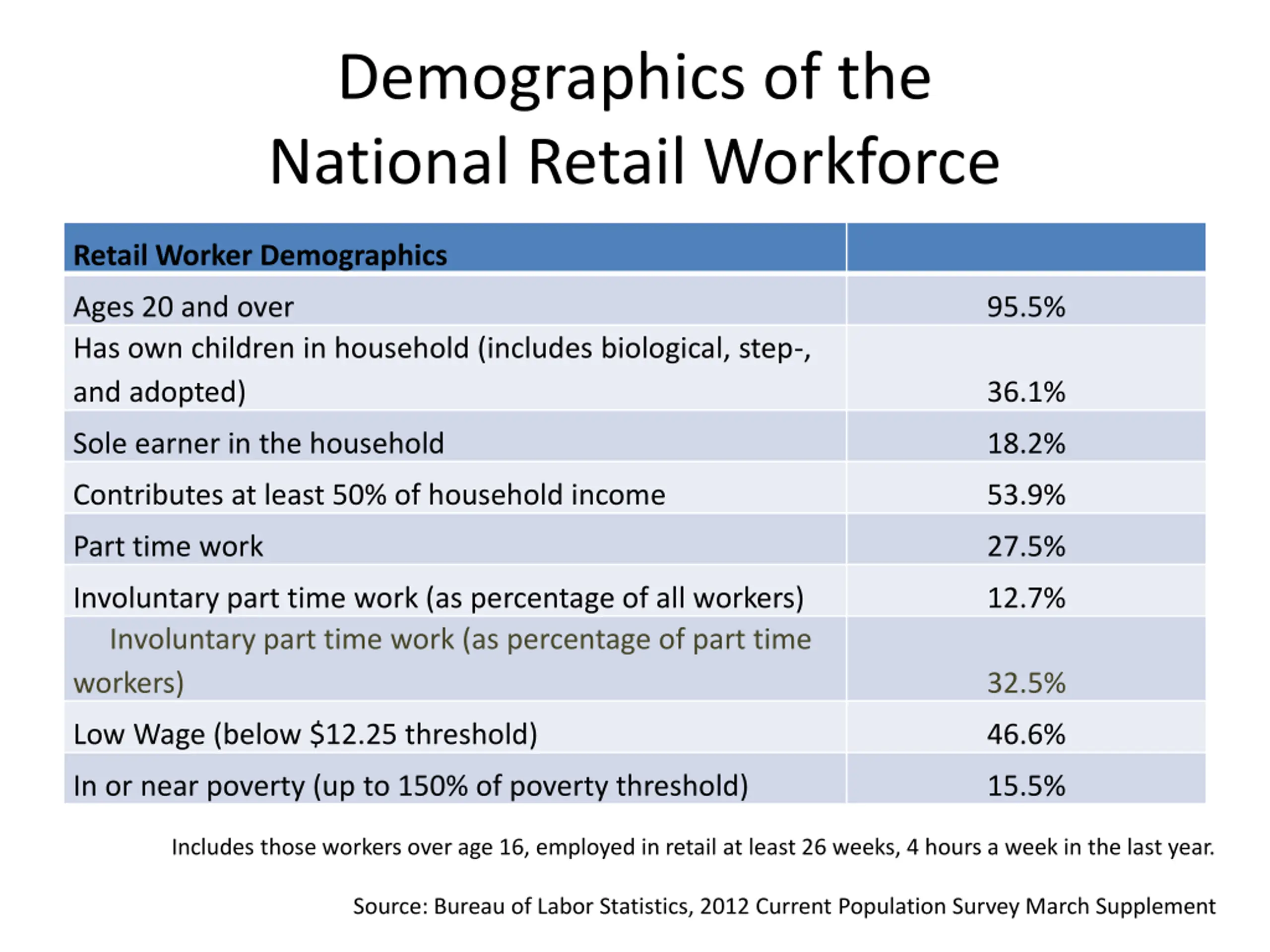 Demographics of the National Retail Workforce Retail Worker Demographics Ages 20 and over Has own children in household (includes biological, step-, and adopted) 95.5% 36.1% Sole earner in the household 18.2% Contributes at least 50% of household income 53.9% Part time work 27.5% Involuntary part time work (as percentage of all workers) Involuntary part time work (as percentage of part time workers) 12.7% 32.5% Low Wage (below $12.25 threshold) 46.6% In or near poverty (up to 150% of poverty threshold) 15.5% Includes those workers over age 16, employed in retail at least 26 weeks, 4 hours a week in the last year. Source: Bureau of Labor Statistics, 2012 Current Population Survey March Supplement