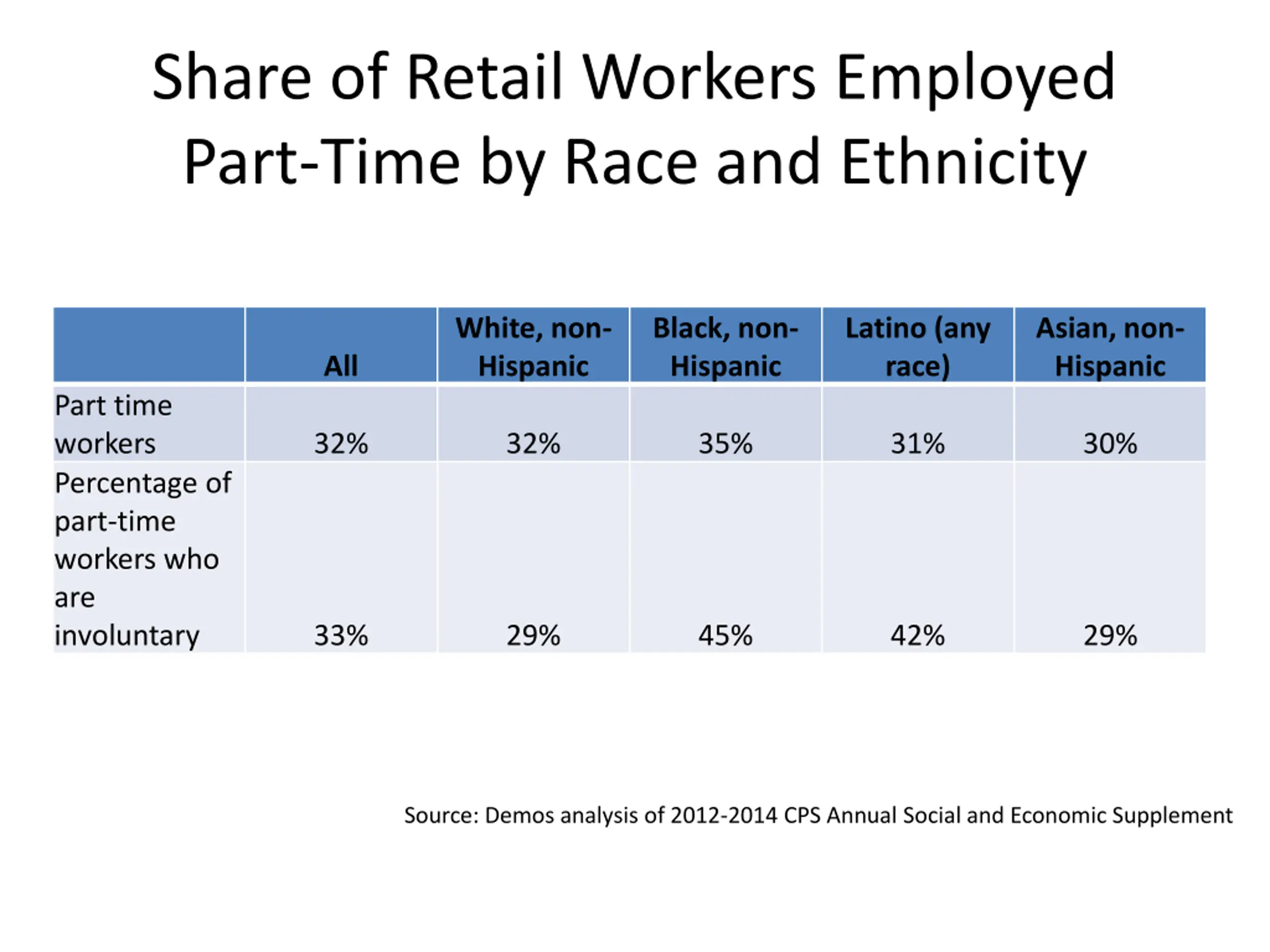Share of Retail Workers Employed Part-Time by Race and Ethnicity White, non- Hispanic Black, non- Hispanic Latino (any race) Asian, non- Hispanic All Part time workers Percentage of part-time workers who are involuntary 32% 32% 35% 31% 30% 33% 29% 45% 42% 29% Source: Demos analysis of 2012-2014 CPS Annual Social and Economic Supplement