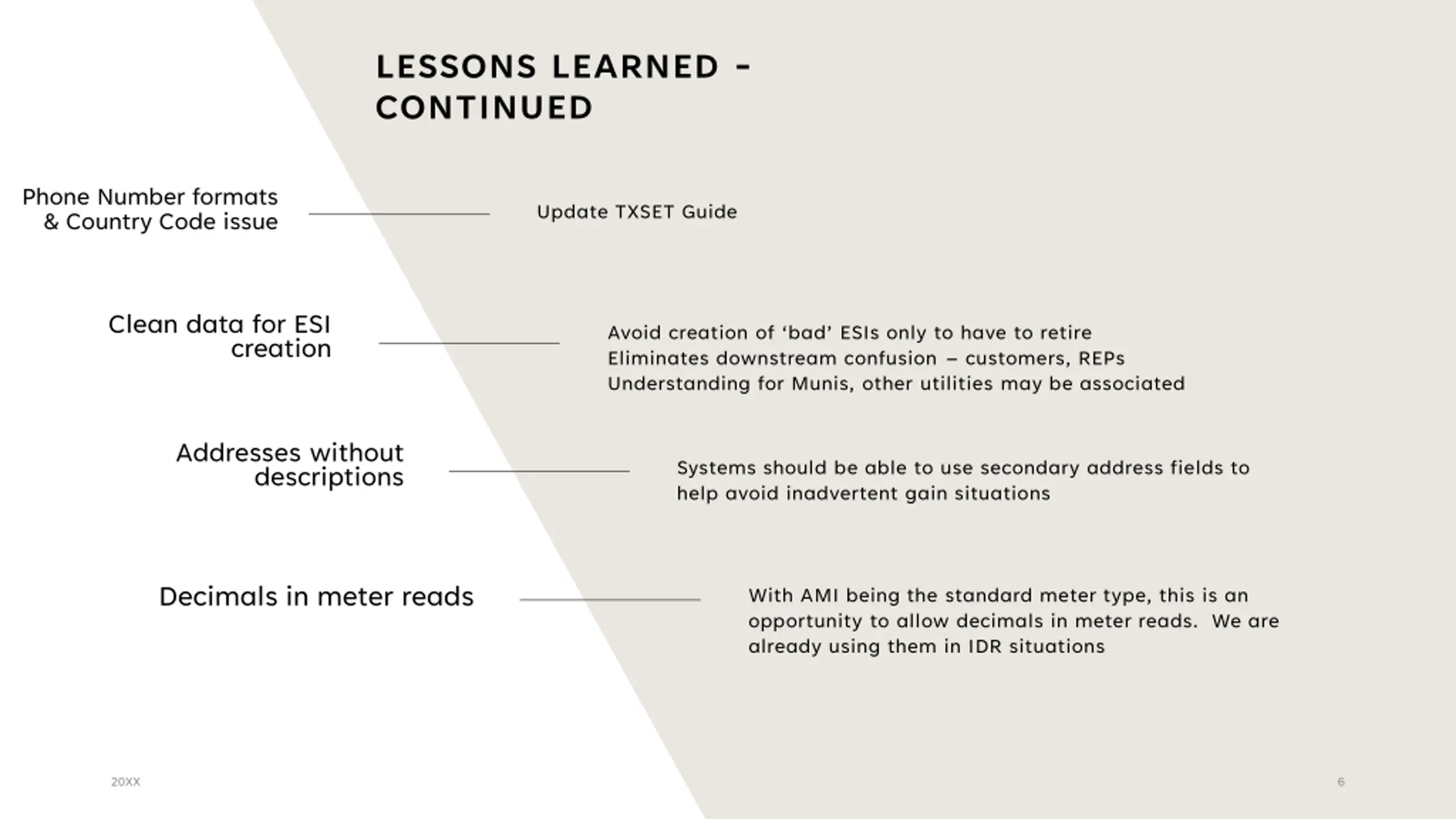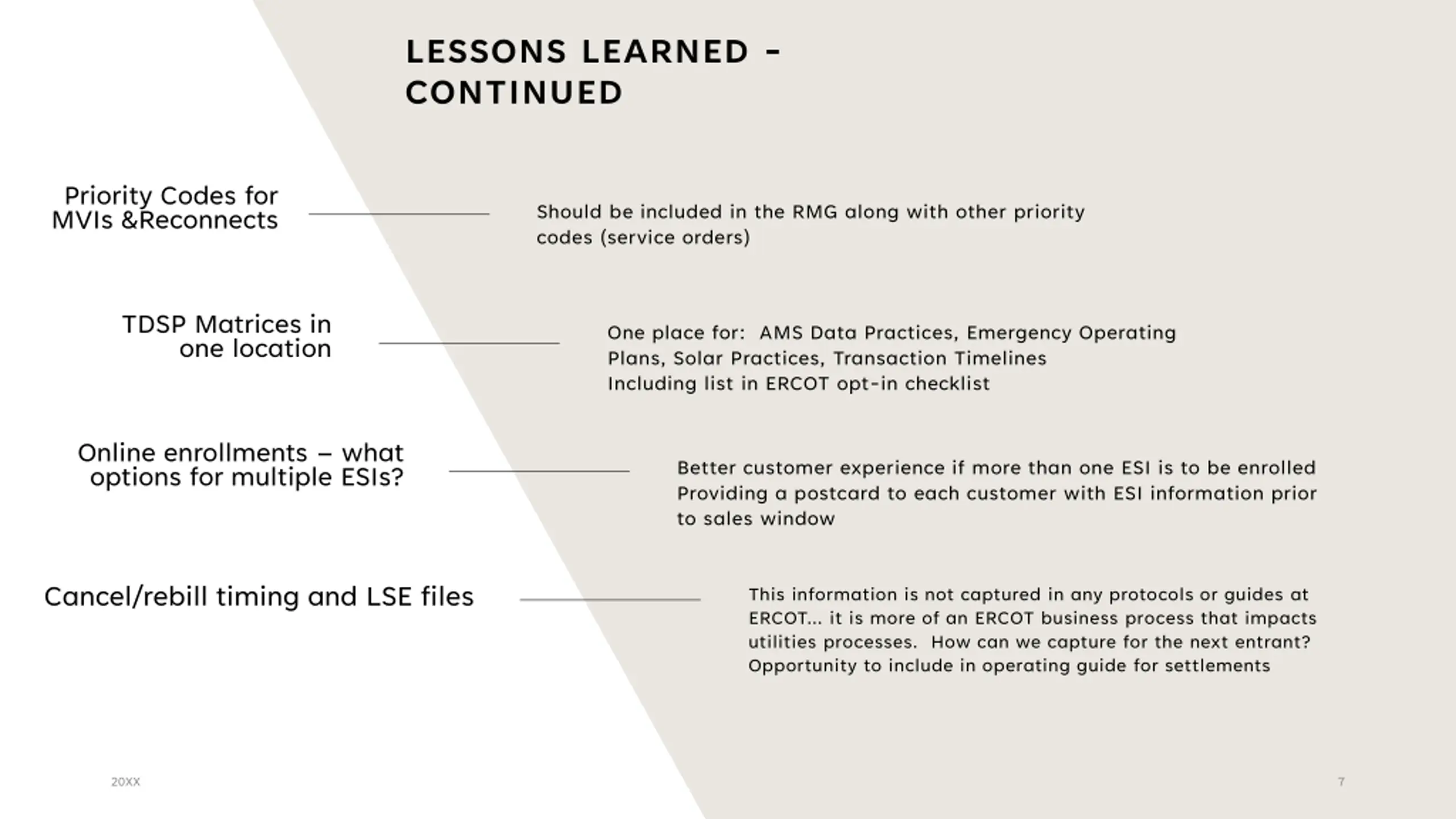 LESSONS LEARNED - CONTINUED Phone Number formats & Country Code issue Update TXSET Guide Clean data for ESI Avoid creation of bad ESIs only to have to retire Eliminates downstream confusion customers, REPs Understanding for Munis, other utilities may be associated creation Addresses without descriptions Systems should be able to use secondary address fields to help avoid inadvertent gain situations Decimals in meter reads With AMI being the standard meter type, this is an opportunity to allow decimals in meter reads. We are already using them in IDR situations 20XX 6
