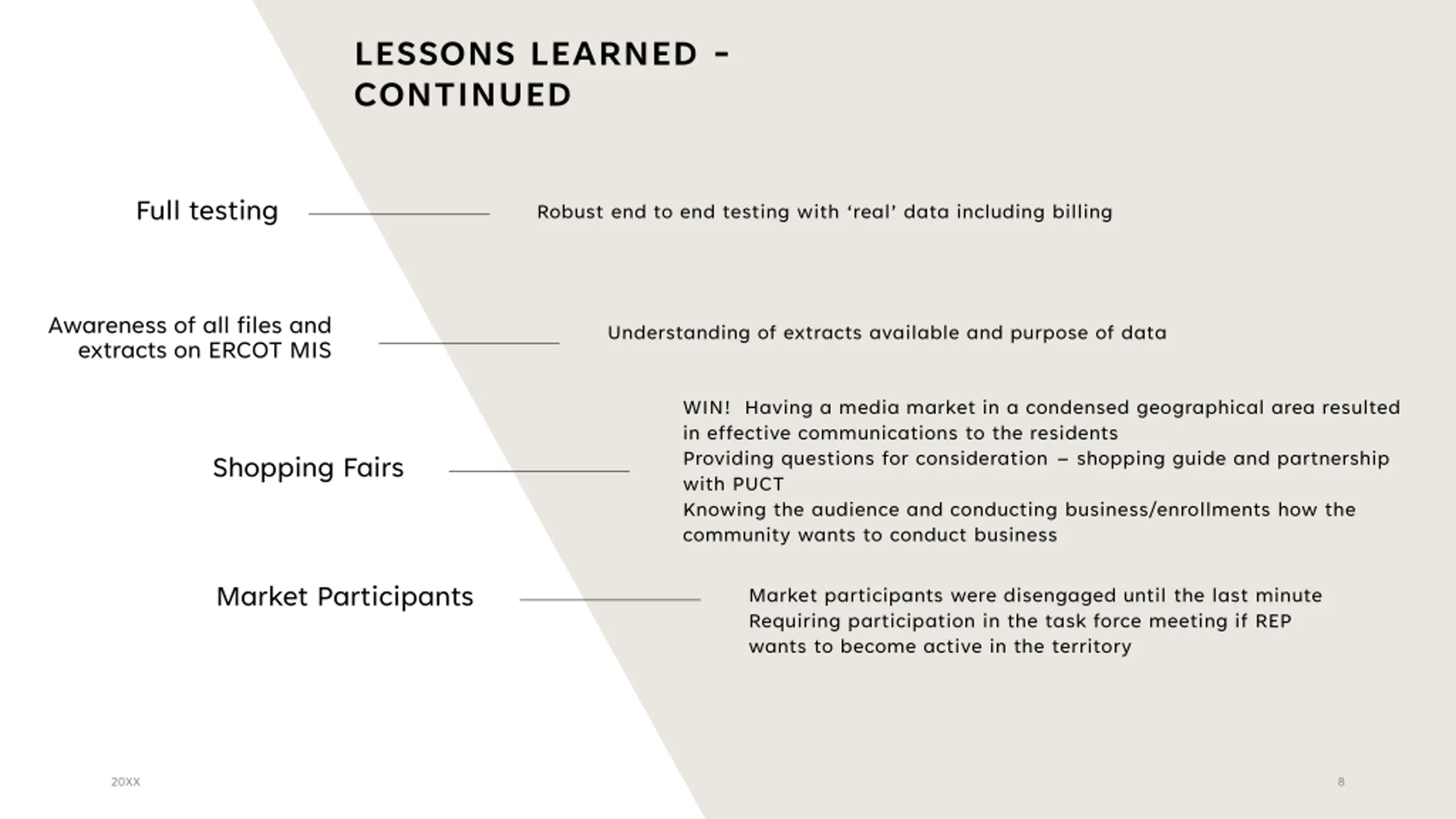 LESSONS LEARNED - CONTINUED Full testing Robust end to end testing with real data including billing Awareness of all files and extracts on ERCOT MIS Understanding of extracts available and purpose of data WIN! Having a media market in a condensed geographical area resulted in effective communications to the residents Providing questions for consideration shopping guide and partnership with PUCT Knowing the audience and conducting business/enrollments how the community wants to conduct business Shopping Fairs Market Participants Market participants were disengaged until the last minute Requiring participation in the task force meeting if REP wants to become active in the territory 20XX 8