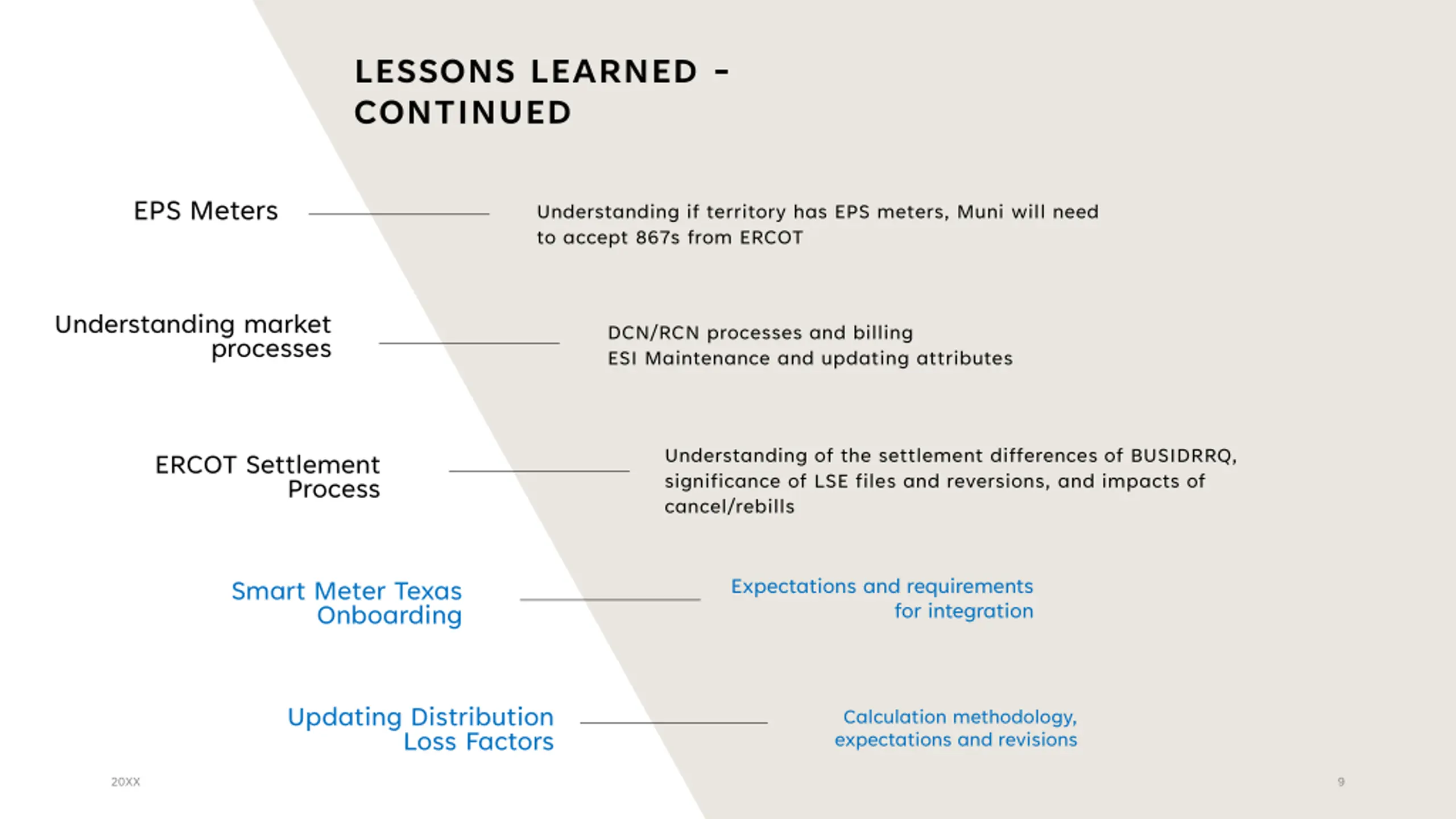 LESSONS LEARNED - CONTINUED EPS Meters Understanding if territory has EPS meters, Muni will need to accept 867s from ERCOT Understanding market DCN/RCN processes and billing ESI Maintenance and updating attributes processes Understanding of the settlement differences of BUSIDRRQ, significance of LSE files and reversions, and impacts of cancel/rebills ERCOT Settlement Process Expectations and requirements Smart Meter Texas Onboarding for integration Updating Distribution Loss Factors Calculation methodology, expectations and revisions 20XX 9