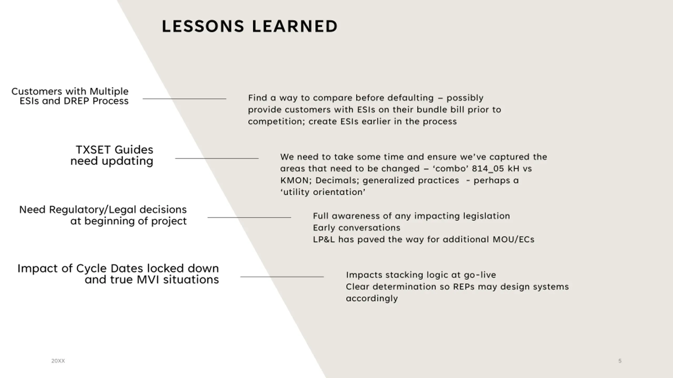 LESSONS LEARNED Customers with Multiple ESIs and DREP Process Find a way to compare before defaulting possibly provide customers with ESIs on their bundle bill prior to competition; create ESIs earlier in the process TXSET Guides need updating We need to take some time and ensure we ve captured the areas that need to be changed combo 814_05 kH vs KMON; Decimals; generalized practices - perhaps a utility orientation Need Regulatory/Legal decisions at beginning of project Full awareness of any impacting legislation Early conversations LP&L has paved the way for additional MOU/ECs Impact of Cycle Dates locked down and true MVI situations Impacts stacking logic at go-live Clear determination so REPs may design systems accordingly 20XX 5